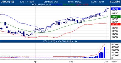 u 30letých bondů USU kurz ceny prorazil horní pás bollingera,což bych viděl jako býčí signál,lze si z opatrnosti i počkat jestli se vytvoří prapor a jako potvrzení vysoké volume u žerdi(což nyní nevíme),potom nákup při proražení resistance praporu.