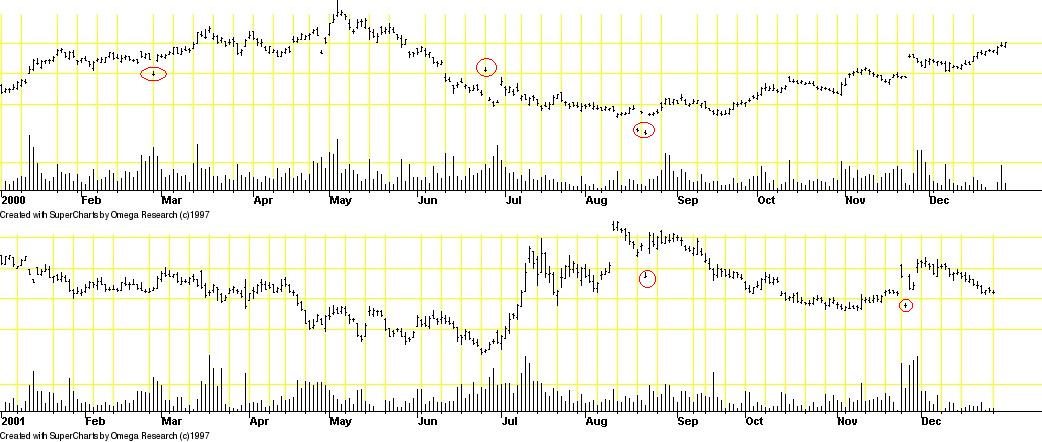 Zdravím vás. Prikladám historické grafy kukurice - roky 2000 a 2001. V grafe som červeným krúžkom označil čiary, ktoré sú mi neni jasné. Čo presne tie zakrúžkované pohyby mohli znamenať ? Sú totiž ako keby "od veci od normálneho priebehu grafu". Ďakujem.