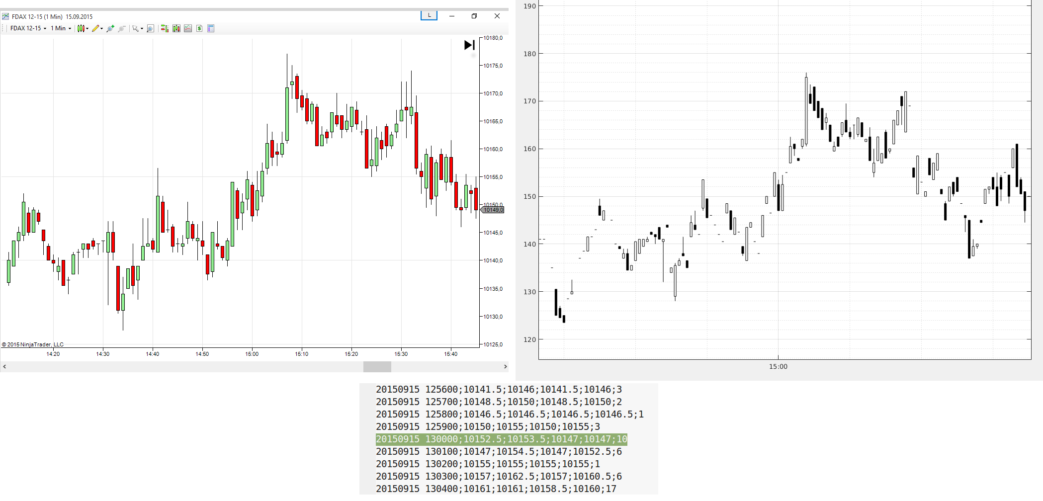 Zdravím všechny obchodníky, rád bych váš požádal o konzultaci ohledně exportu data z NinjaTraderu 7 do txt nebo csv. Používám NT Continuum Demo data feed. Samotný export jde OK s malým problémem posunu času, ale to by nevadilo. Horší je, že se exportují jiná data než jaká NT7 ukazuje. Viz přiložený obrázek - prosím zkuste se např. zaměřit na 15:00 +- pár minut. Na obrázku vlevo jsou minutová data z NT7, na obrázku vpravo jsou zobrazena exportovaná minutová data v jiném programu. Když to porovnám s exportovanými daty, tak zobrazuji správně, ale předem deformovaná data. Ten textový soubor exportovaných dat je tedy deformovaný (výpis textu na obr. dole). Svíčkám chybí knoty případně jsou deformované cenově. Je o FDAX 12-15 z 15.9.2015. Máte prosím někdo podobnou zkušenost a případně řešení? Je to tím, že používám data z NT7 zdarma a NT7 je schválně deformuje, abych byl nucen používat jejich platformu? Děkuji za případnou pomoc.