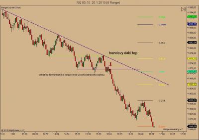Druhá strategie je na NQ, RB2,0, SL50 PT100 (zase testuji výstup u H/L swingu) tolerance výšky 1tick, nikdy ne do 2bR, jedině 1-2-3. Podmínka je divergence na CCI20 a trh se musí nacházet nad EMA17 a EMA102.