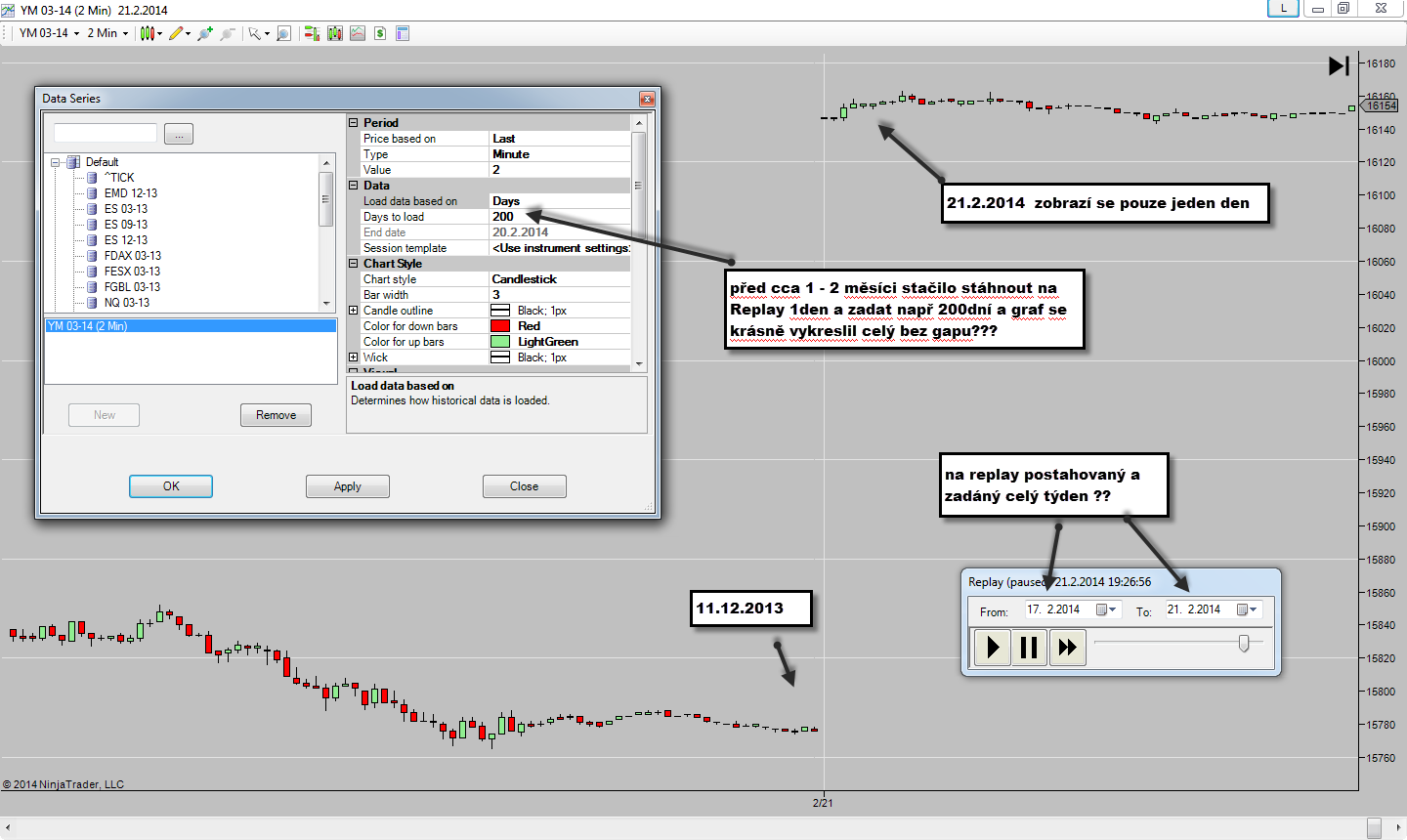 Neví prosím někdo, když si stáhnu Reply data do Ninji např celý týden od 17.2. 2014 - 21.2.2014 a dám načíst, tak se mi vždy zobrazí jen jeden poslední den a když přeroluji kousek zpátky, tak se mi zobrazí den 11.12.2012 ( YM 12-13 ) TJ. poslední den z předchozího kontraktního měsíce s velkým gapem. Dříve mi to šlo tak, že jsem si stáhl na reply jakýkoliv den a zadal v Data Series např 300dní, tak mi to vykreslilo pěkně pospojováný graf bez gapu předchozích kontraktních měsíců a mohl jsem klidně backtestovat celý rok nazpět. Zkoušel jsem vše možné - odinstalovat data v db složce, přes restart instrument, ale zatím bez úspěchu.. Moc by mi to pomohlo, díky.
