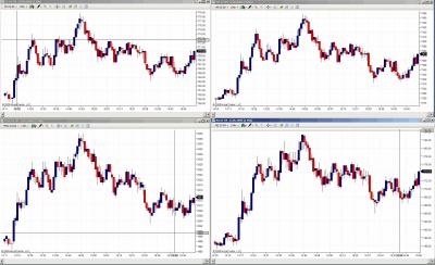 Ještě obecně k diskuzím, že jeden trh je "IN" a jiný "OUT". Stačí si většinou trhy srovnat, udělat si základní porovnání a člověk hned sám vidí, jak se věci mají. Obecně se akciové indexy hýbou velmi podobně a rozdíly v charakteristice jsou velmi malé. Ano, tyto rozdíly lze využít ve svůj prospěch, tj. určitě chápu, že někdo preferuje jeden trh před jiným (sám nejsem vyjímkou) - ale podívejte se na přiložený screenshot ukazující jednominutový graf páteční seance trhů ES,DAX,YM,NQ. Dá se říct, že by některý trh byl OUT, protože se hýbe méně než ostatní? :) Petr