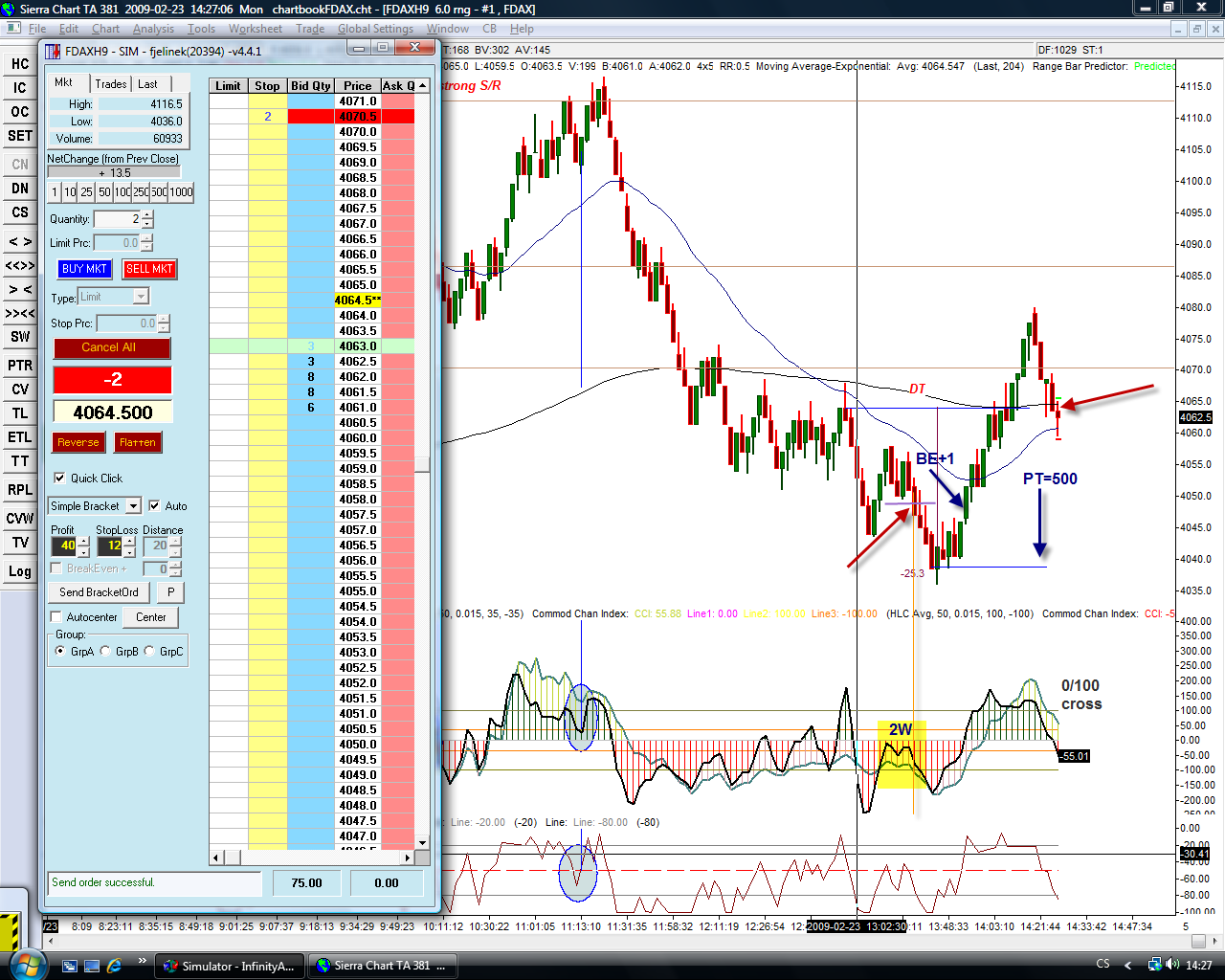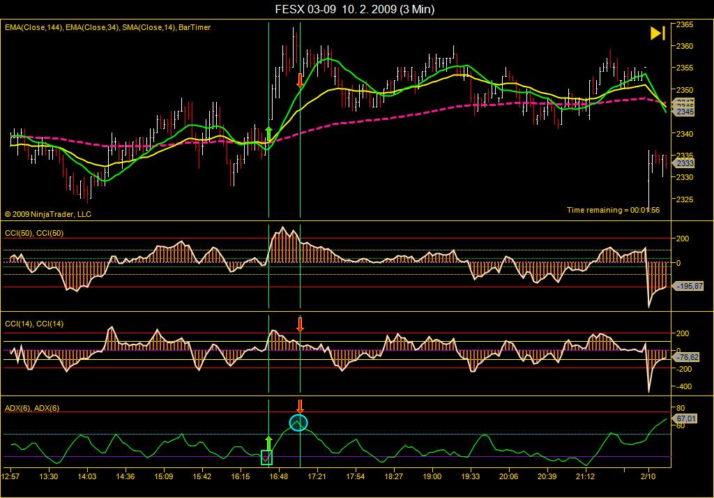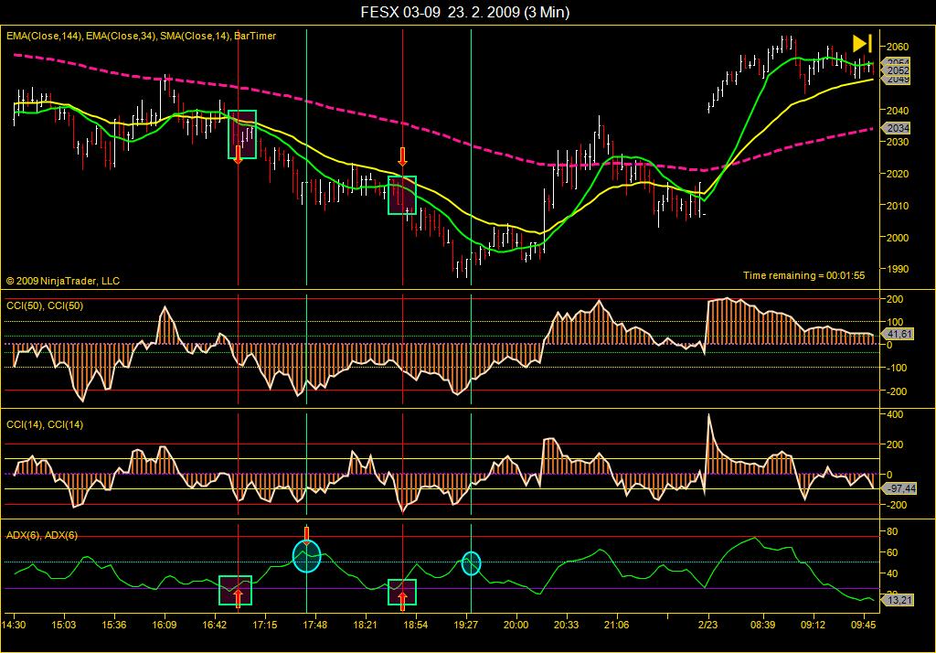 Ahoj Opius, aby si nemusel riešit stále dilemu s profitmi poradím ti ešte jeden indikátor. ktorý je na vstupy a výstupy najlepší zo všetkých ktoré som zatial objavil a aj používam.Dúfam, že ma zas niekto nebude chytat za slovo , že niečo považujem za najlepšie, zdôraznujem že mne sa javí ako najlepší a funguje perfektne. Ide o oscilator ADX , máš ho v indikátoroch a funguje troch ináč ako ostatné indikátory a treba ho dostat do krvi , lebo lahko sa môžeš zmýlit a otvorit opačnú pozíciu. Prikladám screeny FESX a ES trhu kde ho vidíš v akcii, niekedy ide s trendom a niekedy presne opačne . Všetko má svoju logiku a musíš ho skúšať aspoň na 100 obchodoch aby si s ním vedel pracovat automaticky. Pretože používaš Fin-Win pridal som ho do toho systému a pozeraj ako pracuje....čakáš na "háčik" a vstupuješ , alebo vystupuješ. Najprv si definuj trend na Ema 34 a Ema 144 pokial je trh pod tými klzákmi tak jasne že ideo down trend a čakáš na pretnutie klzákov Ema 34 a Sma 9 na dol. Potom definuj trend na CCI 50 či je zhodný s Ema a SMA pokial áno tak pre vstup používaš okrem paternov už len CCI 14 a ADX signály. Použi periodu 6 , normálne je nastavený na 14 a je viac vyhladený a kedže ho chceš používať pre jemnejšie vstupy a výstupy potrebuješ nižšiu periodu ...trocha šumu....Dalo by sa o tom vela písat , ale lepšie je keď do toho prídeš sám. Good luck Gladiator028 ;)