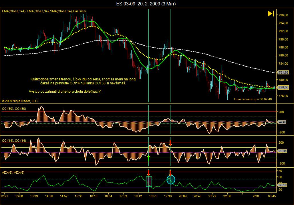 Pri prvom prechode do shortu ukazuje s trendom a potom už vytvára vrcholky a dná , ale pre short pozíciu takže sa nesmieš zlaknut a pri prvom zahnutí do protitrendu vystúpit....potrebuješ sledovať CCI 14 či neprekračuje uroven +100,-100 aj ked to vždy neznamená otočenie trendu(pohybu) chce to len cvik . Je to trošku náročnejšie na postreh, ale veľmi účinné.