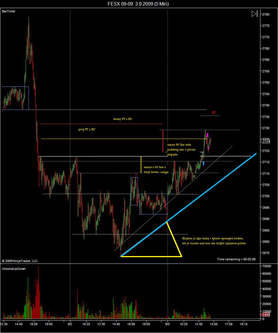Ahoj Simi, prikladam screen s dokreslenými poznámkami. Hlavný trojuholník máš OK , klučom je spodná hranica lebo trh je stupajuci a táto hranica mu robí podlahu. Teda ak dôjde k prudkému nárastu trh má tendenciu vrátiť sa k základu, teda zisky treba vybrat včas. PT si naznačuj po RU a sleduj aj predchádzajuci rast po prerazení klučovehio levelu, v tomto prípade to bolo prerazenie Range a rast mal hodnotu 80 Eur, ak ti vychádza PT na RU vysoko ako v tomto prípade zoberieš si hodnotu predchádzajucehio prerazenia a PT umiestníš v približne rovnakej hodnote či pridáš alebo uberieš záleží len na tebe. Ked vidíš že trh nerobí rast cez 100 eur tak neumiestnuj si PT nad tuto hodnotu. FESX nerobí extra velké swingy a prerazenia tak sa podla toho zariaď. Gladiator028