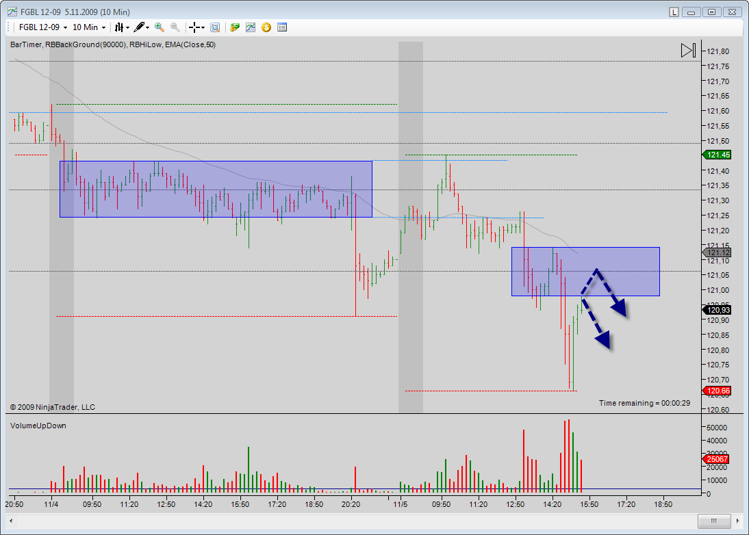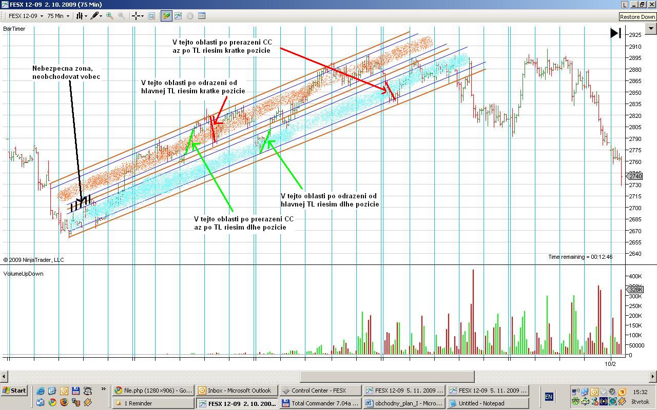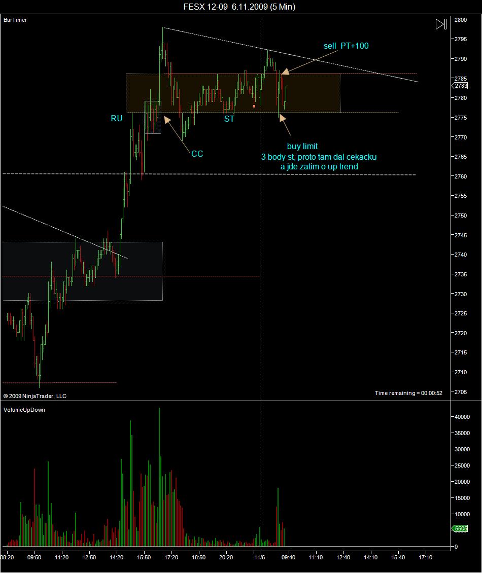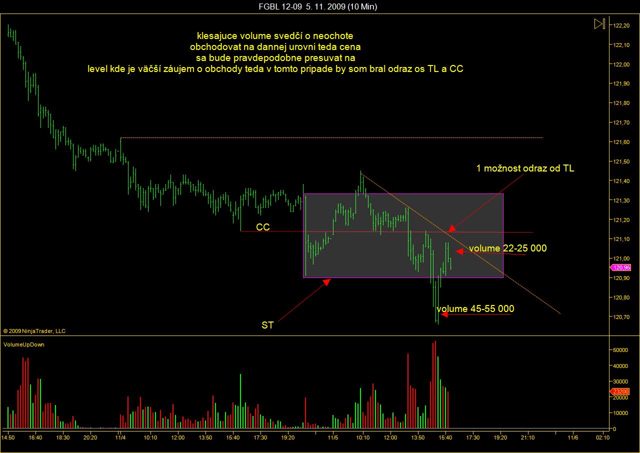 Ahojte som späť, Stomas, chapeš to správne ide o celý priestor nad CC (stredom)kanala. Vasto, pochopil si to spravne až na maličkosť o ktorej som písal a to že ak je kanal longový ako máš na svojom screene obchoduj len longove signaly teda do smeru trendu. Dá sa to samozrejme v oboch smeroch ako si naznačil, ale vyžaduje si to nejake skusenosti. Ak sa rozhodneš obchodovat v oboch smeroch tak do protitrendu (longovy kanal -shortovy obchod)vstupuj len s minimalnym SL . Tktiež treba brat ohlad na to v akom ramci máš kanál , je podstatný rozdiel vstupovat do shortu v 75 min tfku a v 15 alebo 5 min tfku , v nižších ramcoch sa cena presuva rýchlejšie preto by som neriešil Shortovy signal v longovom kanali na 5 min grafe, nestoji to za to , ale rozhodnutie musí urobiť každý sám. Lapaz, bavime sa o tom niekolko mesiacov preto nemôžeš (nemal by si)byť z toho na "větve" to čo Vám tu ukazujem mne trvalo niekolko rokov nikto mi aktívne nepomáhal a stálo ma to vrece penazí, takže určite niesi natvrdlý ale všetko chce čas. Vyber si z môjho systemu nejaku časť a prispôsob si ju k "obrazu svojmu" a budeš v pohode. Recept: Ráno si urobíme dobru kávu , zapneme PC , pustime si príjemnú hudbu potom pridáme 100% sustredenia aspoň 70% dobrej nálady a ideme na to.... ;) Teraz vážne, vytiahneš si ST urovne , kanaly a všetko čo považuješ za dôležité na Dennom grafe, to iste na 240 min grafe ktorý sleduješ už neskôr , denný graf ma význam prvú hodinu (aspoň pre mna) to iste zopakuješ na 75 min, 15, min a 3 min grafe alebo si zvol ine ramce nieje to až tak podstatné dôležité je aby si mal odstup od trhu. Potom sleduješ 15 min graf (10 min) nie nižší ak sa cena priblíži k referenčnemu bodu prepneš na vyšší tf 75 min a sleduješ v akej urovni sa cena práve nachádza , platí že vyšší ramec=dôležitejší signál , ak je to z tvojho pohladu OK aj tam a chystáš sa na vstup prepneš na najnížší ramec a tam odsleduješ ST uroveň , RU, CG atď ak sa v blízkosti Tvojho vstupu na 3 (5min) grafe vyskytuje takato uroveň vstupuješ na nej +,- 2 ticky. Upozornenie , na 15 min grafe vidíš len jednu úsečku ktorá kmitá rôzne rýchlo ale nevidíš rozsah pohybu jednotlivých úsečiek preto ak vidíš narastajuce volume v usečkách na 3 min grafe a rýchly pohyb počkaš so vstupom po dotyku o vstupný bod (nedávaš tam čakačku) neustale sleduješ volume ak to prejde uroven vstupu a spomalí vstupuješ priamo v tejto úsečke limitným príkazom pričom SL ti musí výjsť aspoň 1 tick pod tuto úsečku . Znie to komplikovane no neje to tak , ale chce to prax . Na zaver prikladam screen s "rozrobeným" FGBL , v podsate to vyšlo podla plánu , ale velký profit sa z toho ani nedal očakávať nakoľko FGBL je po 17:00 prakticky "mrtvy" (mimo dní ked sa očakavaju neskoršie správy), vstup sa riešil o cca 16:30 ked už ubuda obchodníkov. Všimnite si volume , usečka s hodnotou 10 000 bola vstupná, pozoroval som ju celý čas z toho polovicu času stála na mieste, trh vyčkával na signál do longu ktorý neprišiel vzhladom na pokročilu dobu a zvýšený objem obchodov na nižších hladinách . Inak takato úsečka "stojaca" je velmi nebezpečná z dôvodu nevypočitatelnosti a preto trba byt pri nej velmi opatrný. Skratka niektore obchody su o volume preto musite prihliadat aj na čas kedy sa ma obchod realizovať lebo môže sklamať aj super patern v nespravnom čase. Gladiator028
