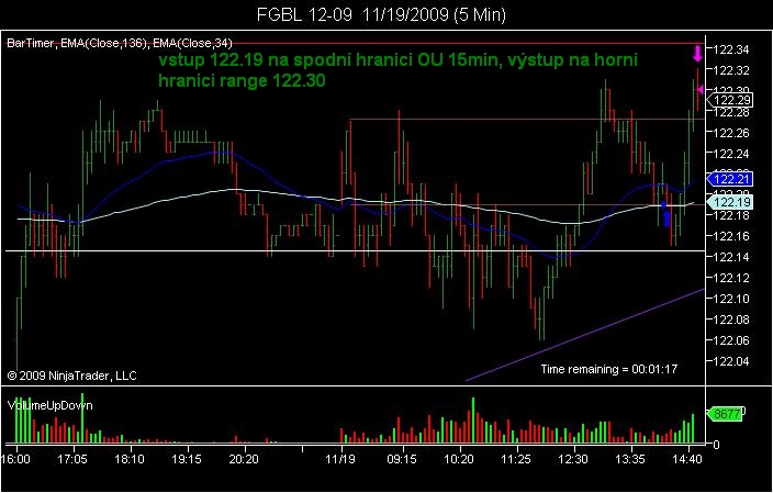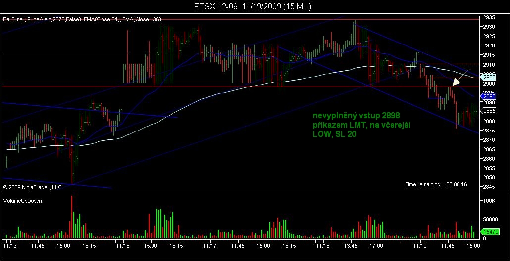 Ahoj všem, mám tady mini obchůdek na GBL, po zkušenostech se špatným plněním LMT příkazů jsem do trhu vstoupil dříve, na spodní hranici OU, která je blízko půměrné ceny(bílá linka).Cena vytvořila denní Low, odraz od TL, následuje vrchol dne a vytvoření range.Pokud bych vydržel dalo se do trhu vstoupit ješte s menším SL.Přesto SL jen 50.Navíc se na 15 TF vytvořila formace 123.Berete takové formace, které nejsou na tžním Low nebo High?? K výstupu...Předpokládal jsem, že cena atakuje včerejší high, ale psychika to bere jinak :-)LMT příkaz umístěn na 122.31, následně posunut na 122.30.Chodím si pro 120, dnes tedy jen 110. FESX LMT příkaz jsem měl na čekačce 2898, nebyl vyplněn, první pokus o proražení v 9.15, cena se vrátila ke spodní hranici OU, (také mini 123) tato formace mi unikla a dala se myslím zobchodovat.Proražení a návrat k LOw předchozího dne, následný odraz 2898 short.Snad je tam i short vlajka, nebo opět 123. Peji všem ať se daří!!