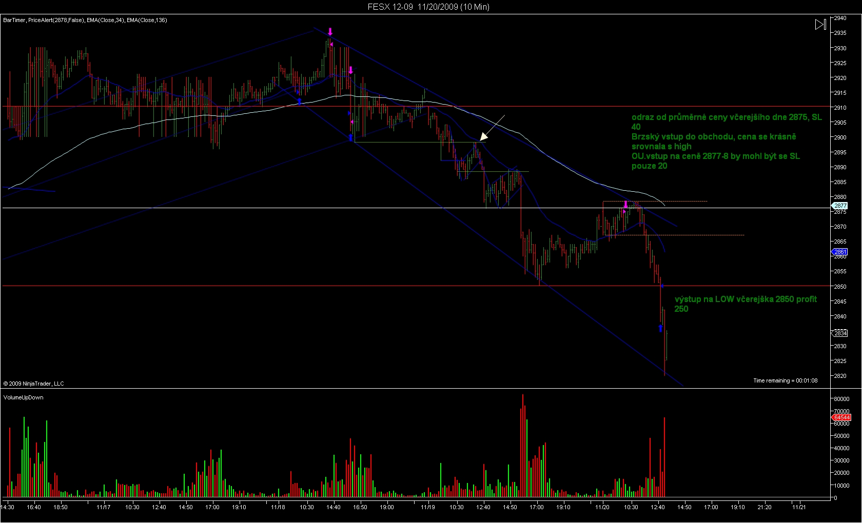 Hi all, při pátku se trhy docela hýbou.Mám tady obchod na FESX.Není tedy zrovna podle mých představ, ale dopadl dobře.Nespokojen jsem s brzským vstupem a jak říká Gladiátor i další zkušení " čekat se vždy vyplatí, nanejvýš nebudte v obchodě" Potíž je v tom, že cena se ne vždy dostane opakovaně až k mnou předpokládanému vstupu, tedy obchodovat odraz a mít co nejnižší SL s sebou přináší riziko vstupu do jiného směru. Další problém je příkaz limit, který není často vyplněn. Chtěl jsem se zeptat zkušenějších na jaký signál k odrazu čekají?