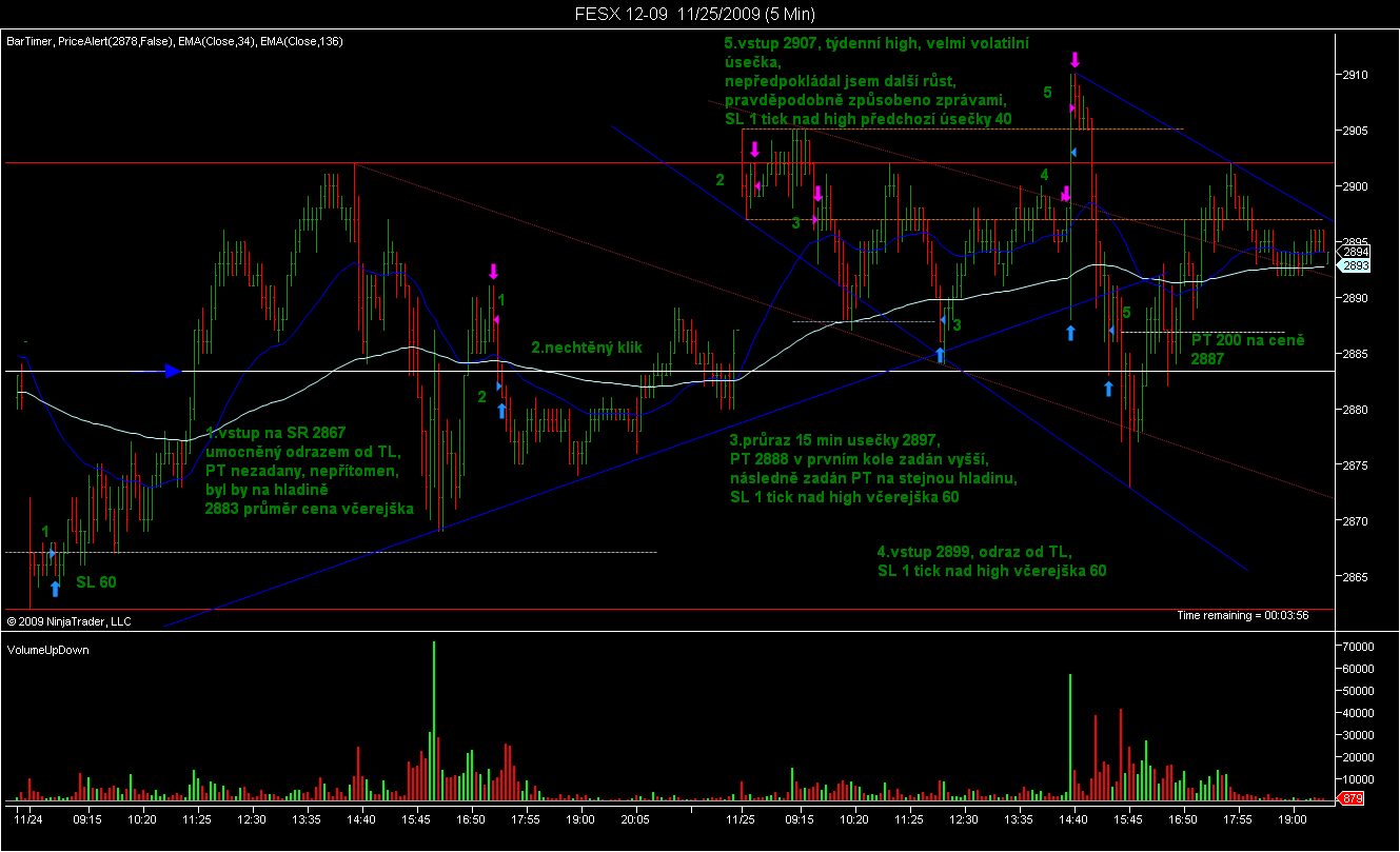 Hi all, zdravím všechny přispěvatele. Mám pár obchodů na dnešním a včerejším FESX, chtěl bych požádat zkušenější o komentář, hlavně tedy vstupů.Jestli je v tom alesponšpetka logiky, mám nějakou představu o tom co by měl trh dělat, ale když se podívám na vstupy, tak mi některé připadají spiše jako gambling, než trading.. :-) Jistá pravidla však mám.Problém je v tom, že bych se chtěl dostat do trhu co njdřív, ale pokud se podívám na vstupy, tak u každého najdu lepší pozici. 1. lépe bylo brát odraz od SR a ne její hned druhý průraz 2.škoda slov, nechtěné ukliknutí, ale když už se stalo, tak jsem to nechal být, vydržel by se SL 90 3.jako lepší vstup vidím čtvrtou úsečku jako odraz na stejné hladině 4.odraz od TL (hnědá)snižující se high i low, možná i 3U, špatný vstup z hlediska vyhlášení zpráv, PT 100 by byl pravděpodobně vyplněn, vzalo mě to však do obchodu v pozitivním slipu, (stává se to často??) 5.vstup na druhé úsečce po velmi volatilní úsečce na týdenním high, tento vstup se mi zdá, ze všech neljepší i když je hodně riskantní, SL 40, škoda brzského výstupu.Ale na druhou stranu i tak pěkný profit. Chtěl bych se zeptat zkušenějších, jak testujete strategie PA, chtěl bych provozovat co nejnižší SL, asi do 50, hdoně záleží na tom, jak je zakreslená TL, od toho se mi odvíjí nejvíc chyb. Přeji hezký večer a ať se daří