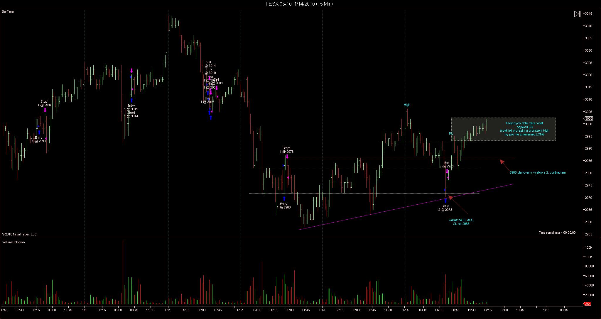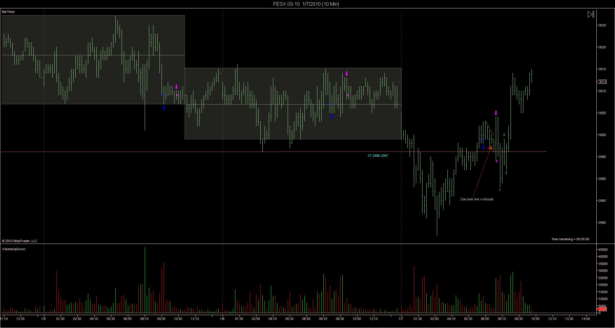 Dneska na FESX jsem vychytal odraz od dna kanalu a CC, vstupoval jsem se 2 kontrakty LONG (poprve, a proto asi ta chyba), a zamyslel jsem vystoupit na PT 6b pouze s jednim, druhy jsem chtel nechat bezet, bohuzel jsem si pri kliknuti neuvedomil ze tam mam porad 2 kontrakty, takze vystup ihned se dvema najednou... vice v grafu
