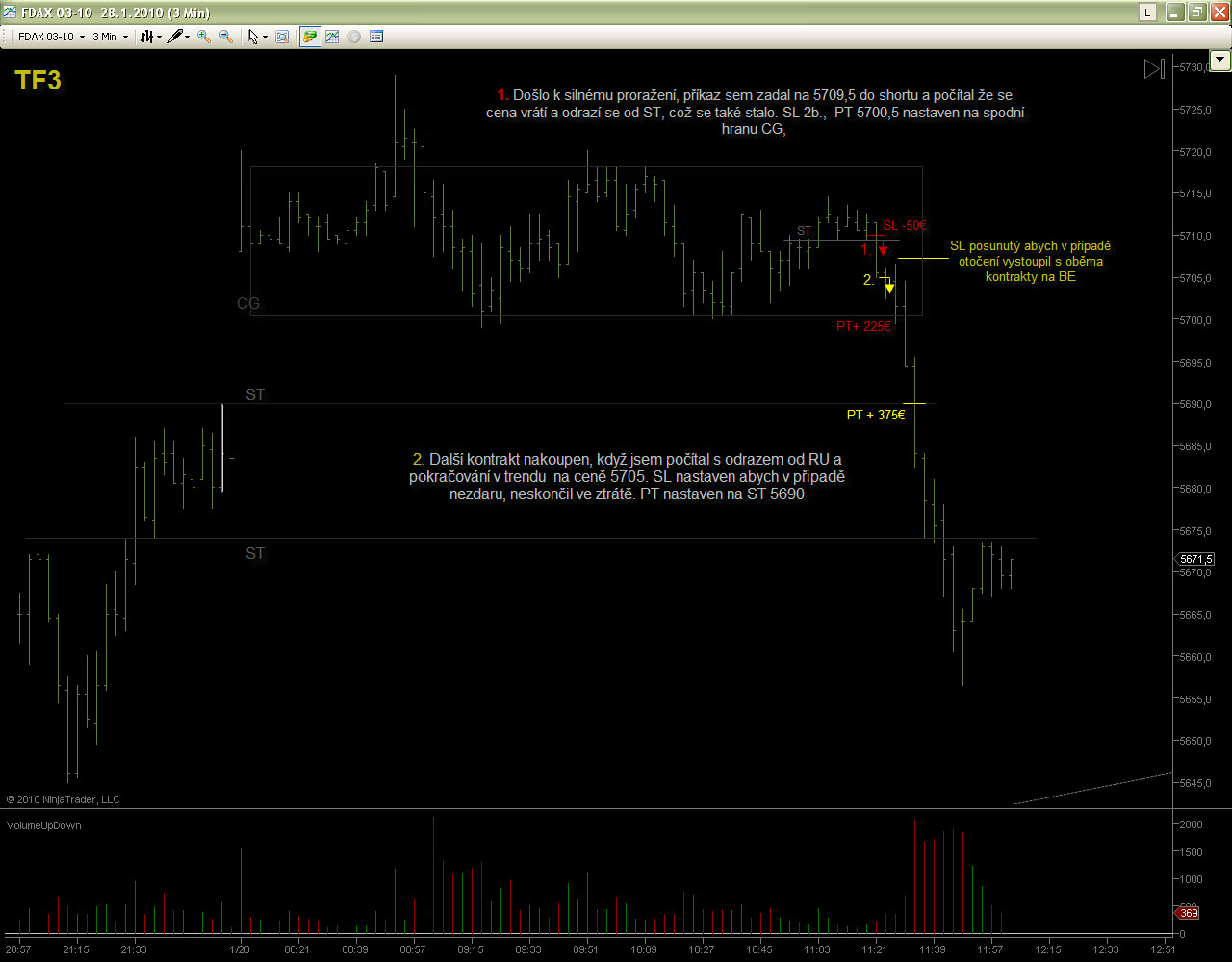 Keď ideš pre profit 112.50 Eur tak si neviem predstaviť Tvoj SL . RRR musíš mať negatívne. To že sa snažíš urvať čo sa dá čo najskôr svečí o Tvojej nervozite a o tom, že si neveríš. Neber to v zlom, ale pri tomto štýle obchodovania na FDAX rýchlo zabudni. Najlepšie sa FDAX obchoduje medzi 9:00 - 11:00 a po obede medzi 15:00- 17:00 , pri otvorení US trhov je ako každý iný trh najvolatilnejší. Pri obchodovaní jedneho kontraktu volume velmi riešiťnemusíš, ide len o to aby si neuviazol v chope. Snaž sa aspoň o PT 250 Eur a urob len jeden obchod denne , uvidíš ako Ti to bude vychádzať , je to drahý a dravý trh tak nech to stojí za to.