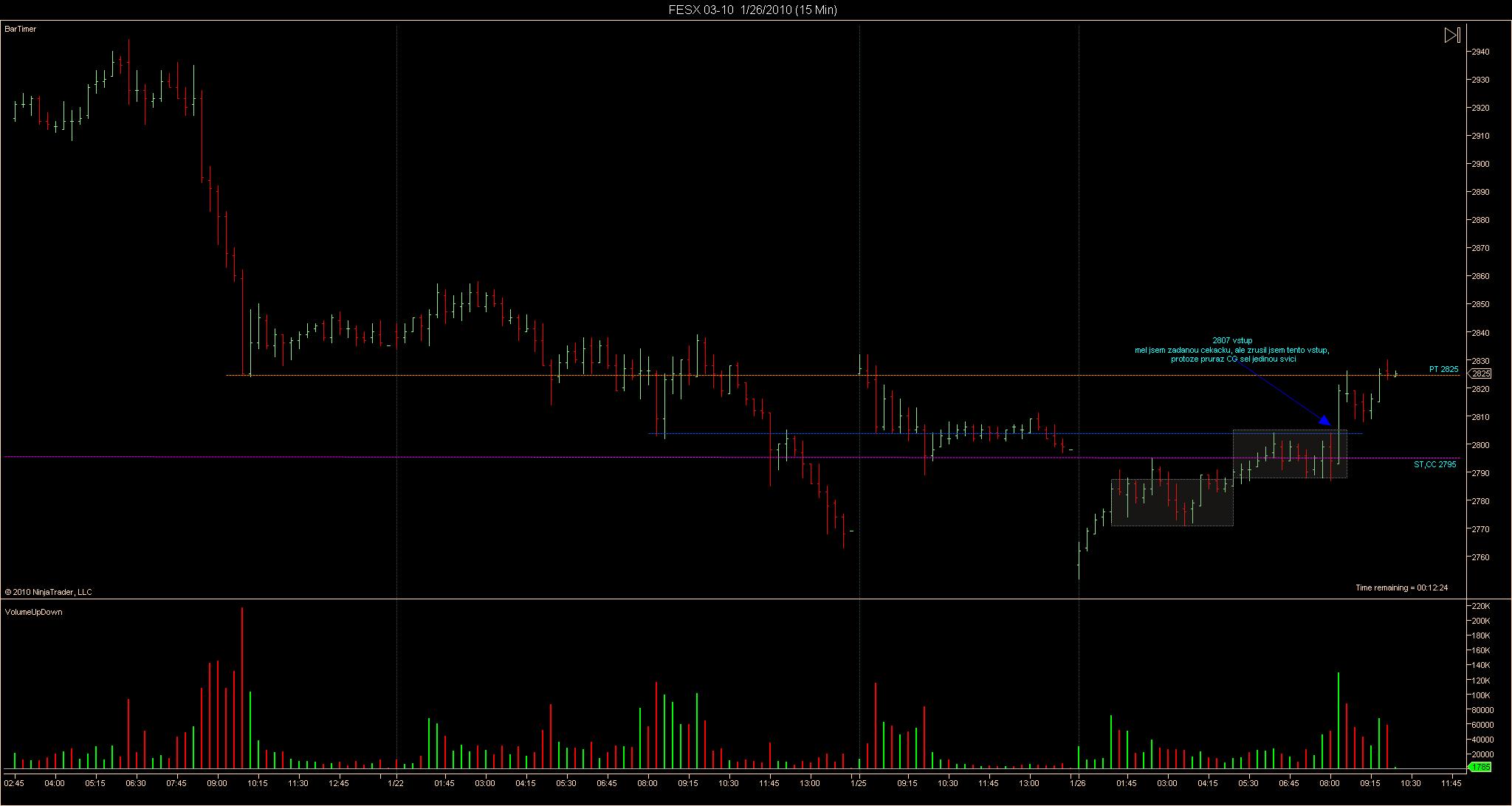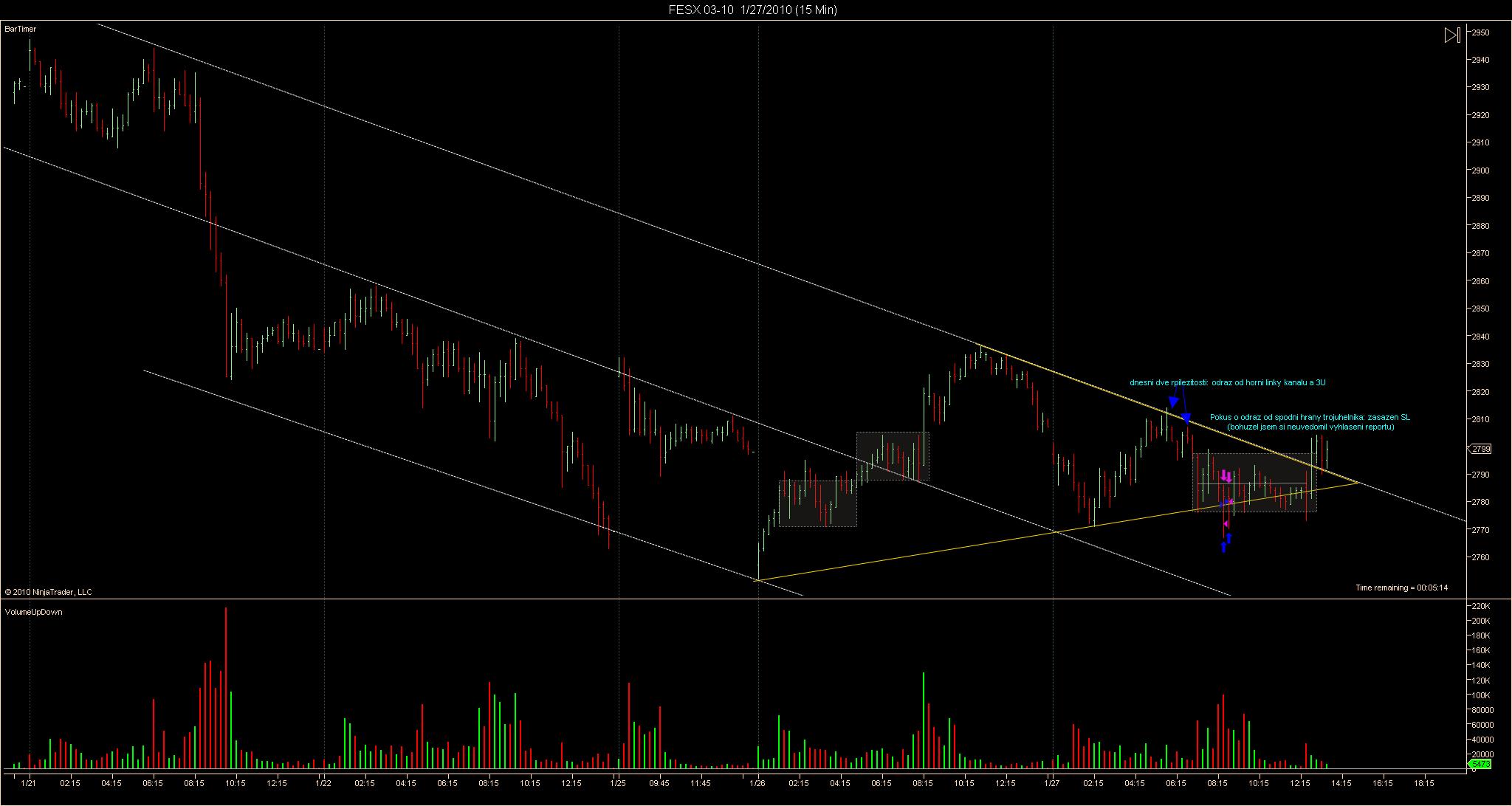 Dneska se sebou moc nadseny nejsem. Zkusil jsem to na odraz od spodni strany 3U do longu...(nevim proc kdyz celkove mam zakresleny shortovy kanal- mozna proto ze se mi nechtelo cekat az zase trh vyleze k horni hrane?) a nedal jsem si pozor na vyhlaseni reportu, coz me ihned razem vyhodilo na SL. Navic nejak nezafungovala automaticka strategie, takze jsem to zavrel rucne s vetsi ztratou(7.b) nez jsem planoval (risk 5b.) Pocital jsem s tim ze se trh obrati na sever a ja potom budu mit moznost spekulovat na prorazeni kanalu, nebo zavrit na BE+1. Dalsi obchod vzapeti byl nejspise emocionalni, chtel jsem to vratit a znovu do toho naskocit, kdyz me ten report tak vysplouchl...ale uvedomil jsem si ze je to blbost honit trhy a tak vystup na BE....a dobre jsem udelal, jinak dalsi SL.
