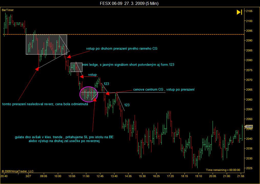 Ahoj všetci, prikladám nejake screeny pre záujemcov o PA system pre trh FESX, ako som už spominal trh FESX sa môže obchodovat pre male profity cca 150-250 Eur na obchod pri konzervatívnom výstupe , ale nakolko tento trh väčšinou rád ťahá dlhé plytké swingy okolo 100 eur reverz tak pre pevnejšie nervy dáva možnosť zotrvat v pozícii aj okolo 4 hodín s velmi zaujímavym profitom. Pre pochopenie PA zo screenov je nutne ovladat aspon základnu logiku pohybu trhu podla Rossovej techniky. Pritom to naväzuje na velmi blízku techniku Market Profile , čo je vlastne vrcholom tradingoveho umenia , ale dá sa naučiť za nejakých pár rokov neustáleho pozorovania trhu, teda je to pre skalných traderov so serioznym záujmom o tento biznis. Je tam zobrazený aj 30 min graf pre pochopenie súvislosti grafov s nižším TF , pokial nevidím najbližší oporný bod na obchodovanom TF prpínam na vyššie TF až sa mi bjavia možné súvislosti budúceho pohybu trhu, včerajšie Hig/Low, blizke CG z minuleho dna atd. To všetko sú velmi dôležité informácie pre rozhodovanie o novom obchode a netreba to podcenovať. Gladiator028