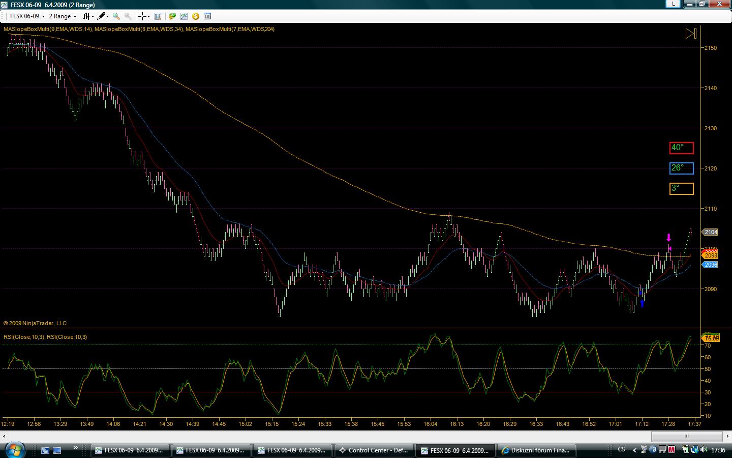 Protoze jsem Rosse nenakoukal natolik abych jel bez indikatoru, pouzivam je hlavne pro konzistentnost a psychickou oporu, protoze pokud se dostanu do stresu na LIVE tak vidim na cenovem grafu kde co a proto se muzu oprit o neco co neni tolik subjektivni. Zatim mam otestovany FinWin II (je to vstup dle Petra, co uci na Emini 2), ale z pohledu Rosse je to vetsinou prvni Rh po 123, prvni Rh po prorazeni nejakeho chopu (jeste presne nepoznam kdy je to Ledge, Range nebo CG :-). Mam filter ze ta korekce na vetsim TF (750 ticku) musi mit minimalne dve usecky proti trendu, pak se mi na malem TF vetsionou udela 100/v....