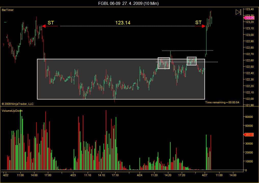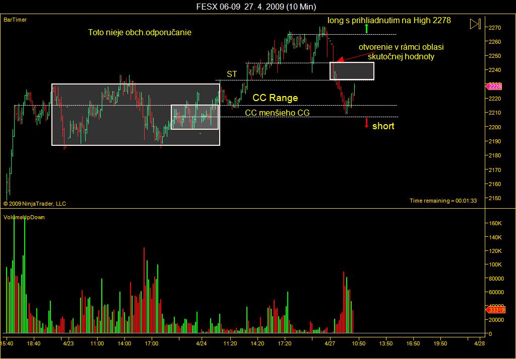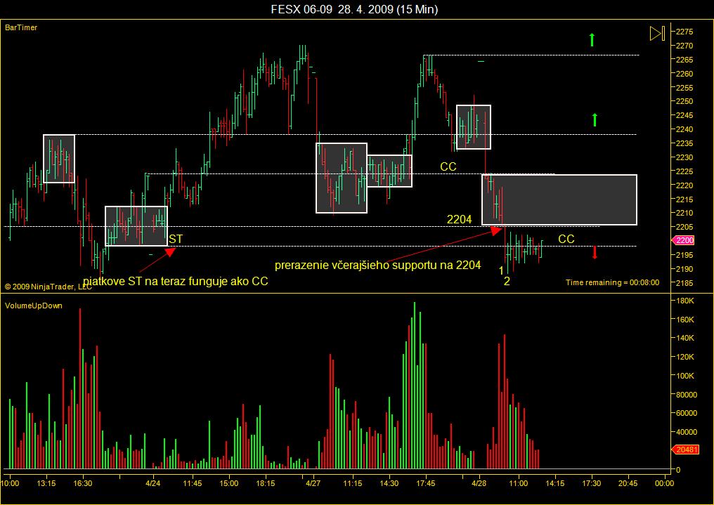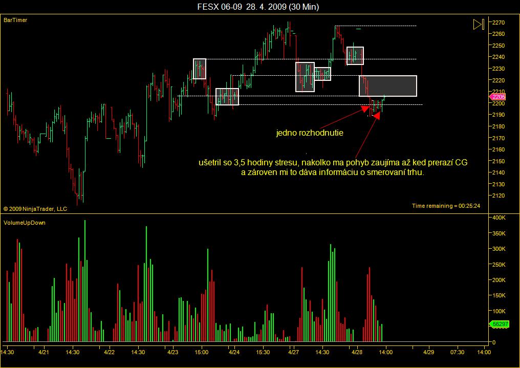 Ahojte, pre dnešok s obchodovaním končím a pripájam screen len tak pre zaujímavosť a zbystrenie Vašich pozorovacích schopností.... Trh dnes zamiešal karty naopak.... prerazenie FGBL sa nekonalo...škoda. FESX taktiež prerazil hore ale úroven 2236 mu poslužila len ako odrazový mostík pre další rast nakolko tam neboli nahromadené príkazy ktoré by ho výraznejšie posunuli hore. Išlo o pretlačenie ceny tradermi ktorý taktiež dúfali , že nad 2236 ich čaká "rýchlovýťah" a kedže tam nebol museli vyšlapat pomaly po svojich.. :) Gladiator028