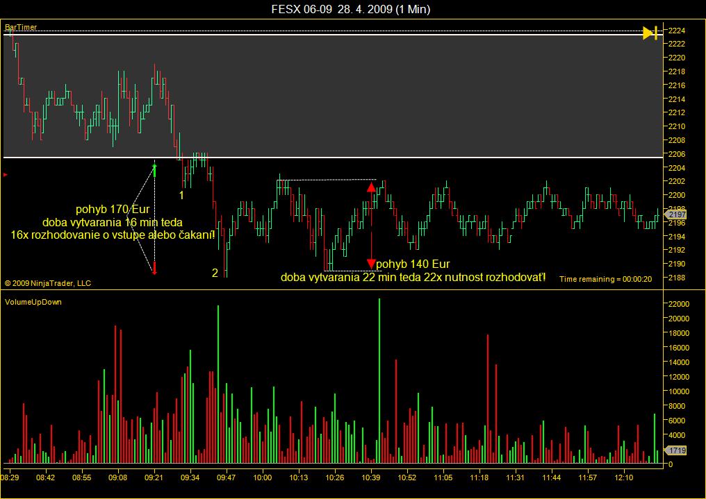 Ahoj Radusor, je to jednoduché, čím nižšie TF tým väčšia hladina stresu nakolko musíš robiť rozhodnutia každú chvýľu a to ide len o malé pohyby. Teda ryskuješ napríklad 70 Eur pre pohyb 30 Eur, ked chceš väčší zisk musíš sa stresovat dlhééé, dlhééé minúty ked ta hypnotizuje graf ktorý skáče hore dole a nemá to až takú výpovednu hodnotu ako vyššie TF, lebo čo sa tebe zdá ako krásny swingový obchod je v skutočnosti pohyb do strany, ktorý tam môže vyklepať každú chvýĺu. Na 1 min grafe sa ti zdaju male pohyby ako obrovské a to Ťa tahá do akcie . Predstav si trh ako džunglu ktorá je hustá a velmi členitá -1 min graf- má vela pahorkov -swingov -ktoré musíš vyšlapat a to Ťa samozrejme psychicky aj fyzicky vyčerpáva a tak možno ani nedôjdeš do cieľa. Musíš sa presekávať mačetou a dávať pozor každu chvýľu či z huštiny - trh do strany - na teba nevyskočí nejaký had - reverzná úsečka - ktorý ukončí tvoj život- obchod. Teraz sa na to porieme z druhej strany. Kým ty sekáš mačetou porast a pomaly sa predieraš do predu s nasadením života, ja si sedím pod palmou popíjam pivko a čakám kým mi otroci - ostatný nedočkavý traderi- urobia cestu . Ked už vidím záblesk svetla za huštinou -začinajuce preražanie CG pomaly sa postavím odhodím tak 10 fliaš od piva do koša.. :) a idem vyšlapanou cestou do akcie , bez námahy , bez rizika....teda s menším rizikom a zoberiem profit za cca 5-10 minút ktory si Ty musel oddrieť za 3,5 hodiny....pozri screeny. Jasnejšie to už neviem napísať tak dúfam, že to už každý pochopí.. (tu) Good Luck Gladiator028