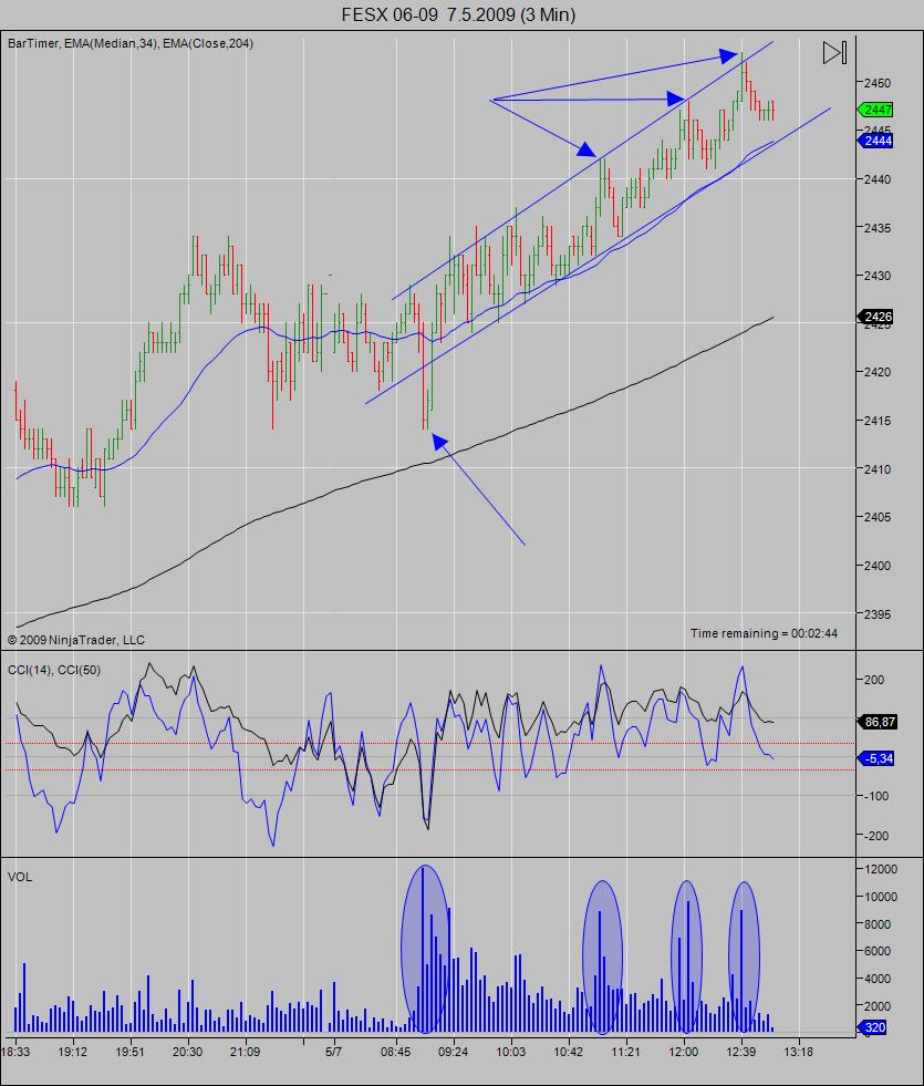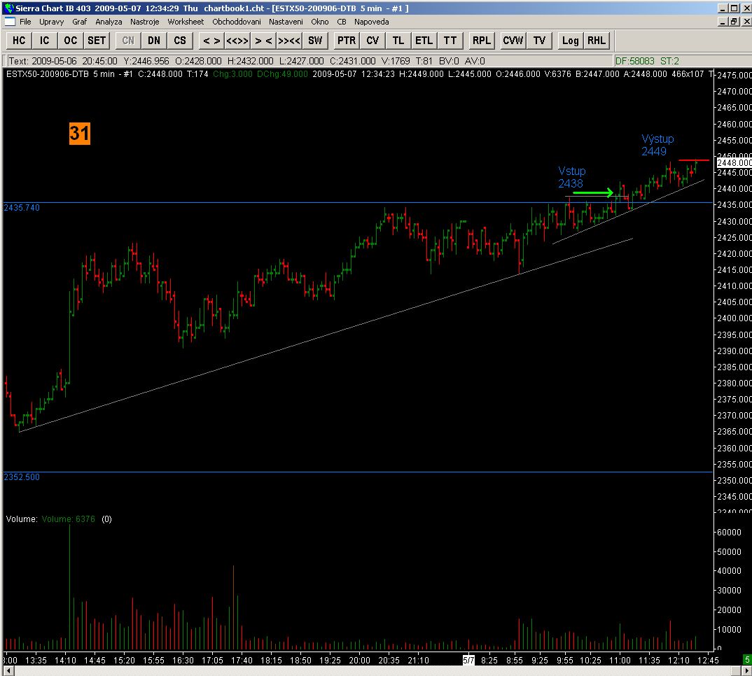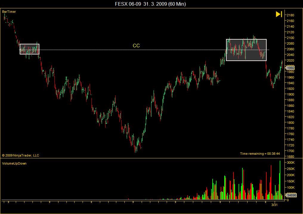 Dnes jsem si všiml jedné zajímavosti. Zajímalo by mně , jak se na to díváte vy, zkušenější. FESX je celý den v kanálu. 4x se stejným volume došlo k ataku hranice tohoto kanálu. průlom down byl falešný a když insaideři zjistili, že Up to bude asi levnější zopakovala se velmi podobná situace ještě třikrát v opačném směru. nárůst volume byl cca trojnásobný, což mi připomnělo Rossovy slova : aby se zaplatily náklady na zvýšení (snížení ceny komodity) je potřeba k uzavření pozic a následnému výdělku v opačném směru trojnásobného počtu kontraktů. taky jsem uvažoval o obchodování longu na dolní hraně kanálu se SL 2-3ticky a PT 5-6ticků v každém swigu. První obchod by byl malý risk, ale pokud by vyšel, každý další by už byl bez rizika neboť by byl zaplacen prvním obchodem. až poslední obchod by nevyšel. neumím odhadnout míru rizika volatility , zda by takto malý SL stačil obecně, ev. zda při RRR 1:1 stojí za to riskovat 5ticků pro stejný profit (pokud nejsme insaideři, že). anebo mít pevné nervy a udržet se při umazávání papírových zisků a počkat až kanál doleze k lepšímu PT