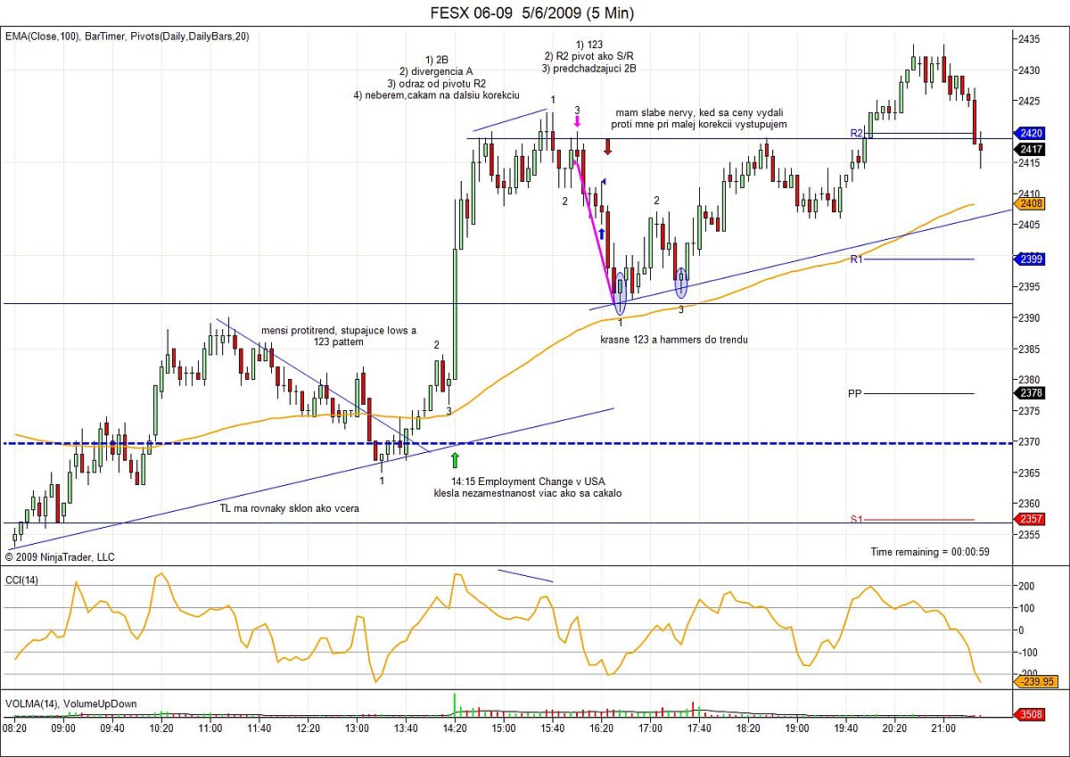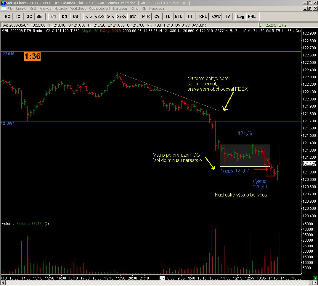 Ahojte všetci, takže pre druhý obchod som sa rozhodol na FGBL. Obchodoval som prerazenie CG, Vol do mínusu narastalo a to ma utvrdilo, že pohyb na juh je reálny. Našťastie som mal nastavený moj "malý PT" lebo potom sa utvorila nepríjemná korekcia. Takže prednešok s obchodovaním končím a budem už len sledovať čo sa deje.