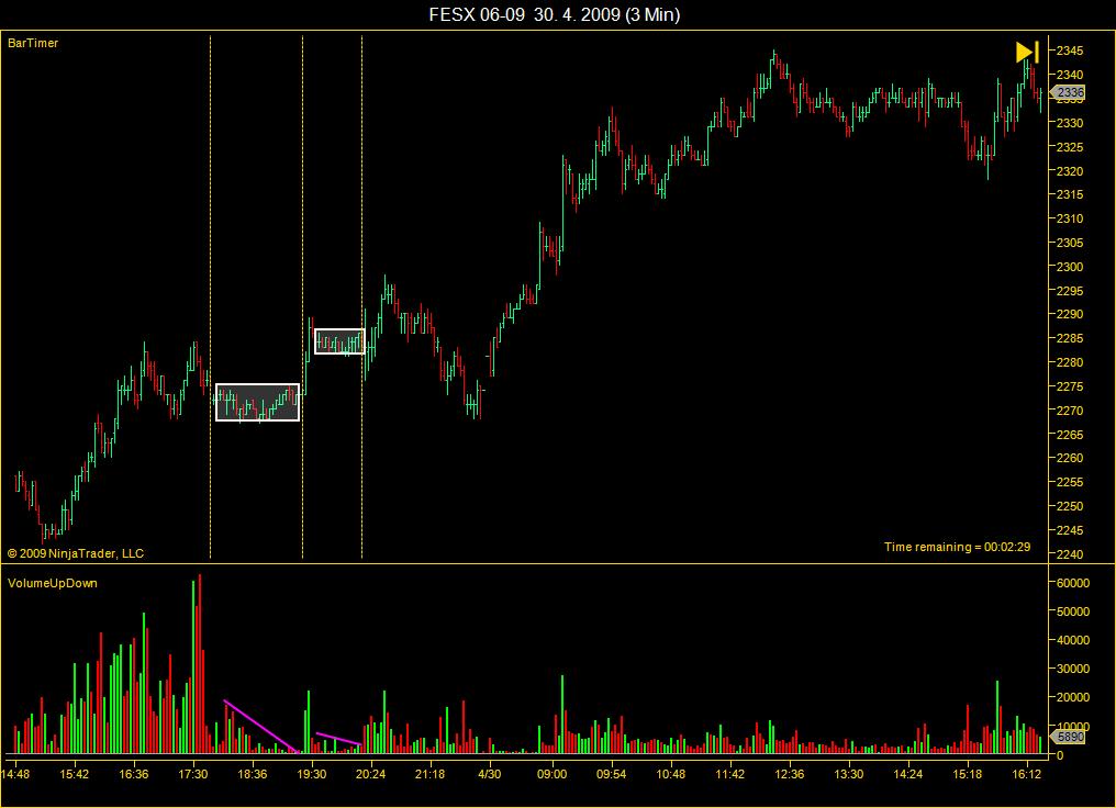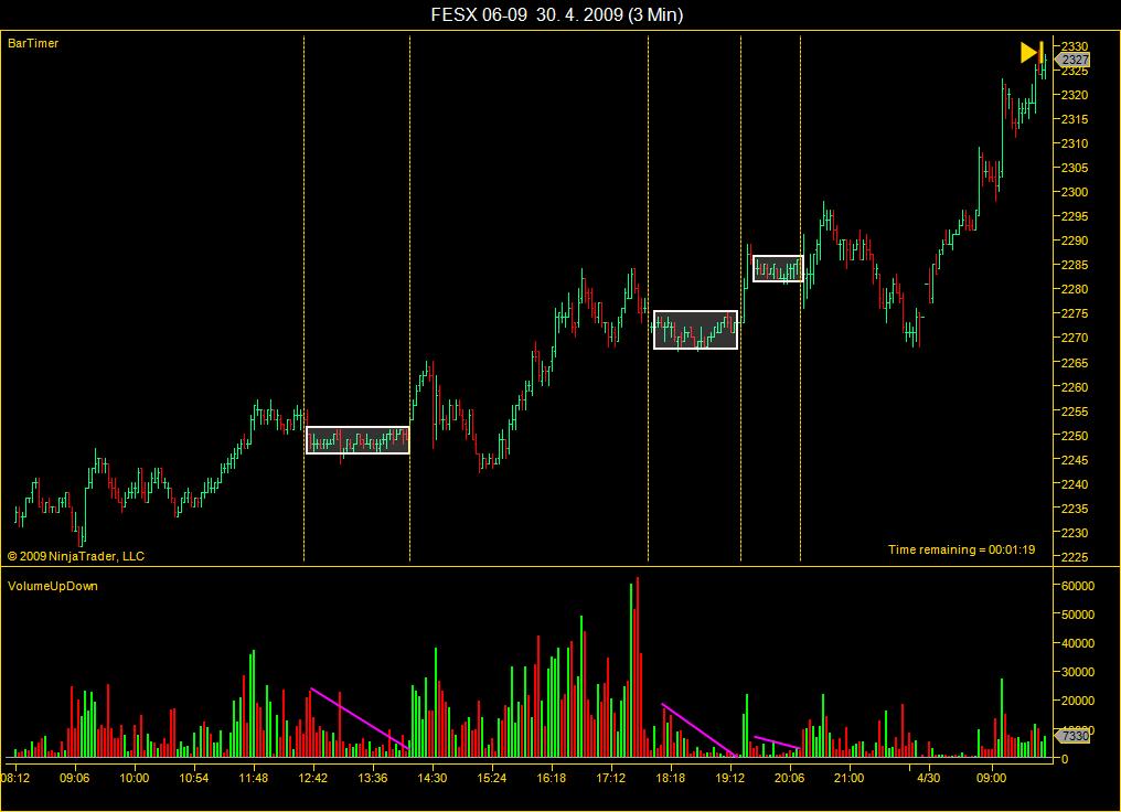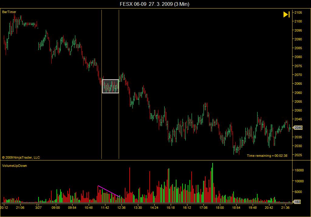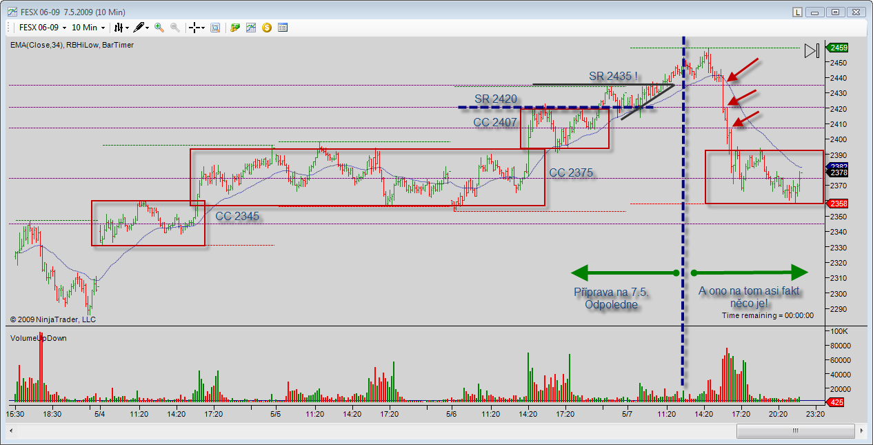 Ahoj Mahrlo, tieto pohyby sa deju neustále, ale najzaujímavejšie su silne suportne urovne aj ked su z dalekej minulosti. Ako som už písal trh má pamäť, vdaka tomu môžeme profitovat na paternoch, lebo sa neustále opakuju. Ostatný traderi tak isto hladaju podobne paterny a tak isto na nich reaguju preto to cele funguje. Ten kto si to neuvedomuje je pozadu , lebo si myslí že nemá záchytny bod a tak čaká na nejaký kým sa vytvorí, ale v tom čase sú už ostatný "nabalený" . V sobotu ked nebeží trh otvor si grafy ,natiahni si historiu tak pol roka do zadu a zaznamenavaj si najsilnejšie cenove úrovne s poznámkami ako dlho cena odolávala, napríklad suppord odolaval 2 hodiny na 15 min grafe , alebo 2 dni atď. Urob si tabulku takýchto cien a maj ju po ruke. Ked sa trh priblíži k tomu bodu tak pozoruj ako sa správa a podla toho sa rozhoduj. Nemusíš vidiet priamo graf z minulosti, stačí ti poznámka o cene a dátum kedy to vzniklo , prípadne si to môžeš v rýchlosti pozriet aj v grafe. Dalšia maličkost je, že väčšinou pred prerazením CG klesne volume , lebo obchodnici sa nevedia dohodnut na cene a tak sa postupne vytrácaju"zadnými dverami" , alebo čakajú. Vtedy vstupuju "parketáci " a nahodia nákupne príkazy nad CG na čo obchodníci zareaguju ako ryba na návnadu a bežia za cenou. Inými slovami prebieha dražba a ked o umelecke dielo nieje záujem musia znížit/zvýšit cenu aby trh zareagoval a je odkleputé. Niekedy klesne volume len v jednej úsečke , ale v dlhšom CG klesa volume postupne a to dáva signál na umiestnenie príkazu. S pravidla čím užšie a dlhšie CG tým silnejšie prerazenie. Pri range so šírkou cez 100 EUR je prvé prerazenie väčšinou sonda -periskop a až druhe , alebo tretie prerazenie má účinnosť. To všetko musíš narénovať pozorovaním grafov. pozri screeny, niekedy je to výraznejšie niekedy menej , ale treba si to všímať. Gladiator028