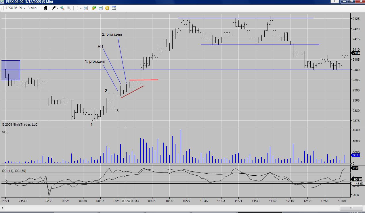 lapaz: diky za screen, je to vlastne vsechno hrozne podobne, jenom u toho prorazeni uz se da "vycitit", jestli se trh rozjizdi nebo nebo, coz ja v korekci jeste nevim. A dost casto se mi stavalo hlavne vecer na TF, ze v korekci byl trh dost slaby a kdyz ji prorazil, tak se pekne rozjel nahoru, ale to uz pro mne bylo pozde na vstup, protoze by to nebylo podle OS. Me se docela libi pattern 1-2-3, ale se vstupem az po prvni korekci v novem trendu. Dneska byla jedna takova hypoteticka situace (ale jenom hypoteticka, protoze byla proti trading range ze vcerejska), takze tak bych si predstavoval svoje vstupy. Vstup na 2. prorazeni - vlastne prorazeni RH. Ale jeste to musim vymyslet s vyssim TF, jak to skloubit a kde ty patterny hledat, protoze treba to 1-2-3 se ukazalo pouze na 3min TF a na vyssich to byl hladky obrat. A taky jak si davat pozor na ty CG apod., takze me ceka hodne prace. V Trading je business to vypadalo pekne, ale vsechno to bylo na dennich grafech, takze si pockam na Daytrading a uvidim. Ale filozofie bude stejna, cim mene obchodovani, tim lepe. Lada