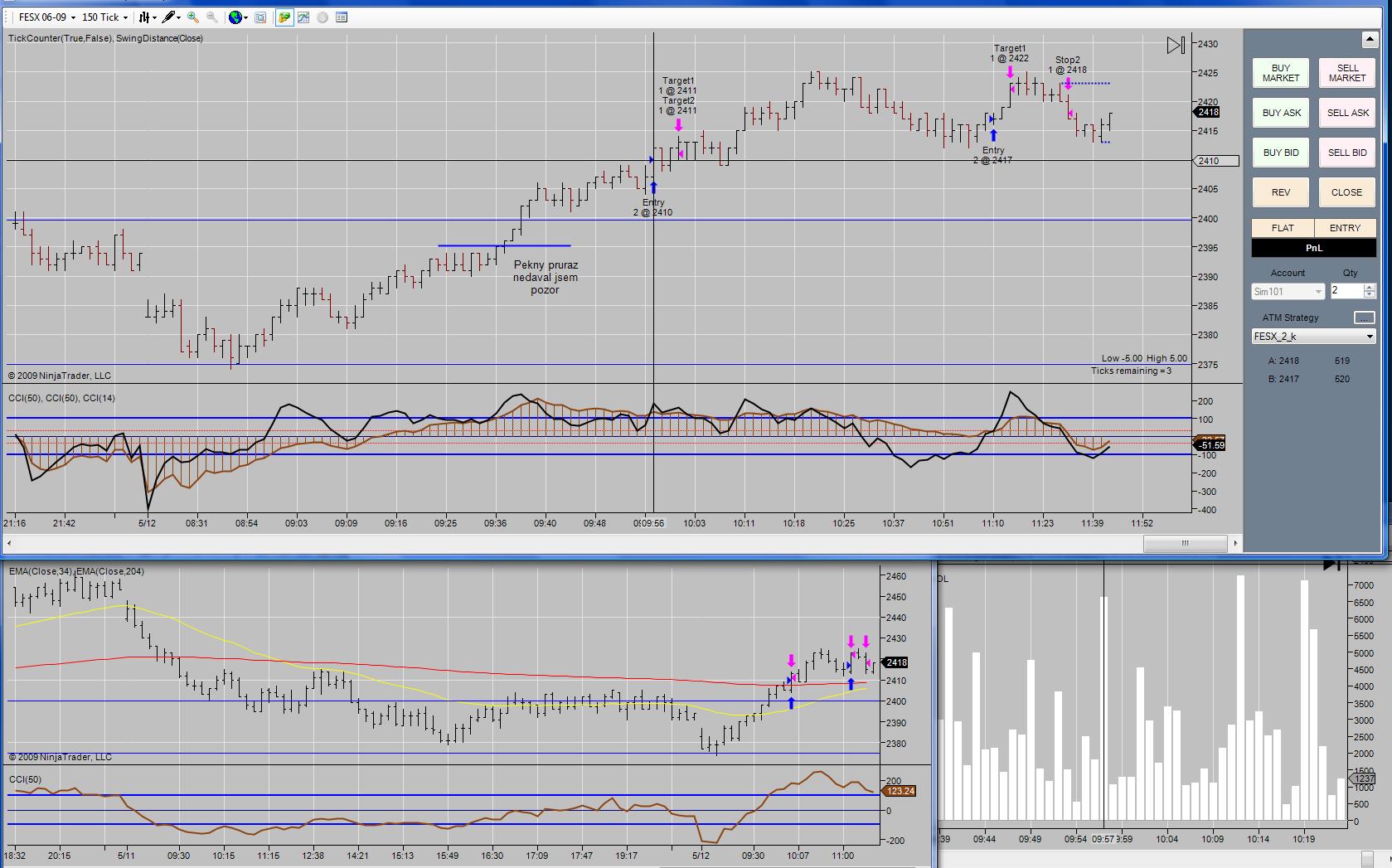 lapaz: ja mam cas hajeni do konce srpna. A zacatek FESX si posunu asi az do cervence, protoze ho musim poradne nakoukat. Krome dvou dni minuly tyden zacinam vlastne az dneska. Minulou stredu jsem na TF udelal 4 spatne obchody, takze jsem si dal na zbytek tydne volno dokud se hlava nevycisti a hlavne nebudu vecer delat vic nez 1 obchod denne abych nemel prostor pro "dohaneni svych ztrat", protoze to je pro me smrtici. A jelikoz do prace uz se mi nechce, tak to bude chtit hodne discipliny do obchodovani a ta zatim chybi. A ta streda byla docela spatna, uvazoval jsem, ze TF uz opustim a taky ze mam spatny system. Pak jsem se ale uklidnil, system je dobry a navic vydelavat se da i s nahodnymi vstupy, takze to chce jenom zkrotit hlavu. Mam ted vytisknutou tabulku na 20 obchodu a zacinam ji plnit obchody, ktere verim, ze budou jenom podle planu. A pak snad hlavu presvedcim, ze nezalezi na jednom obchodu, takze se tak nemusim stresovat. A je super, ze clovek ma hodne casu, aspon muzu cist. Uz jsem precetl od Rosse Trading je business a docela se mi libi jeho vstupy. Protoze kdyz se obchoduje pruraz, tak se vetsinou trh rychle rozjede aspon na BE, coz mi maximalne vyhovuje. A pokud se trh nerozjede, tak vim, ze to neni dobry obchod a mam cas vystoupit. A tak jsem si objednal i Daytrading a Trading Ross Hook, tak uvidim. Casu na zkouseni novych myslenek je dost. Ale abych nebyl off-topic, tak prikladam svoje dnesni obchody na FESX: 1. obchod BE+1 - maly pruraz doprovazeny velkym narustem volume. Ale po vstupu volume spadlo a trh sel do strany, takze jsem to uzavrel, protoze pruraz ma byt zivejsi, takze si pockam na lepsi prilezitost. 2. obchod BE+1 - pattern 100/v, na vyssim stale uptrend, takze vstup. Ale trh slaby, dostal se pouze k high dne a pak se obratil zpatky. A to by pro dnesek stacilo. Tak hodne discipliny vsem. Lada