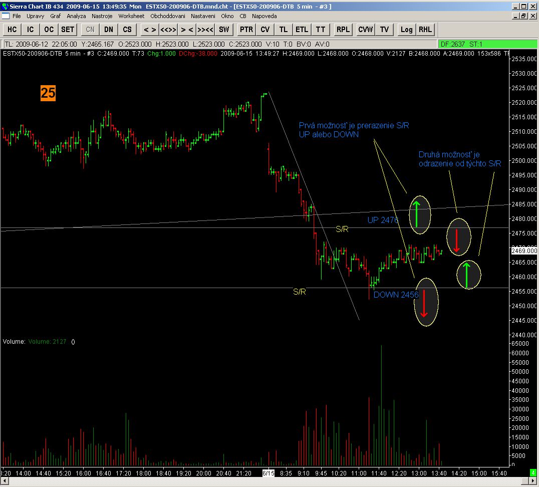 Jako první indikátor na FESX používám jednoduchý breakout systém prolomení 20 nebo 80% hranice nejnizších resp nejvyšších cen za posledních 7 obchodních dní. S ohledem na toto pravidlo budu nakupovat pokud se cena vrátí na 2477. Pokud se vrátí tak věřím k vyrovnání dnešní otevírací ceny.