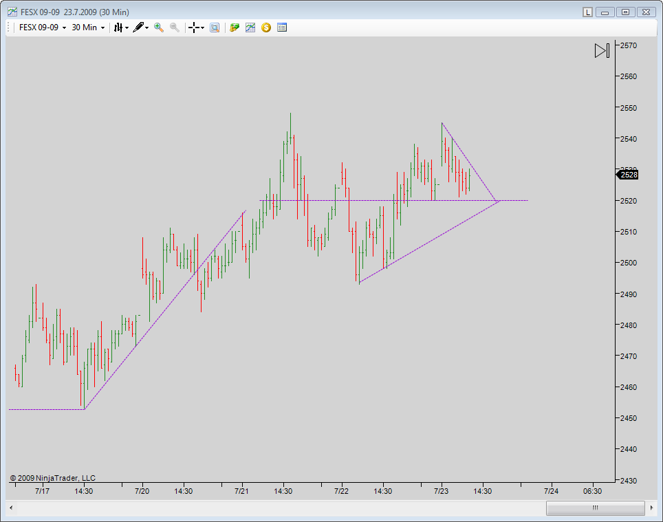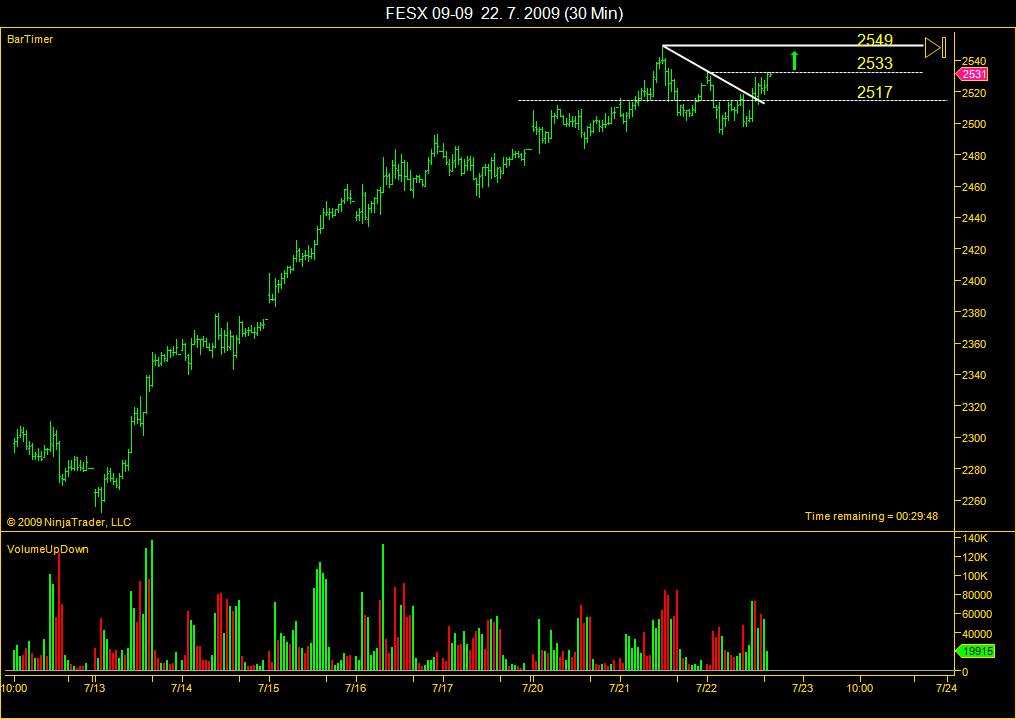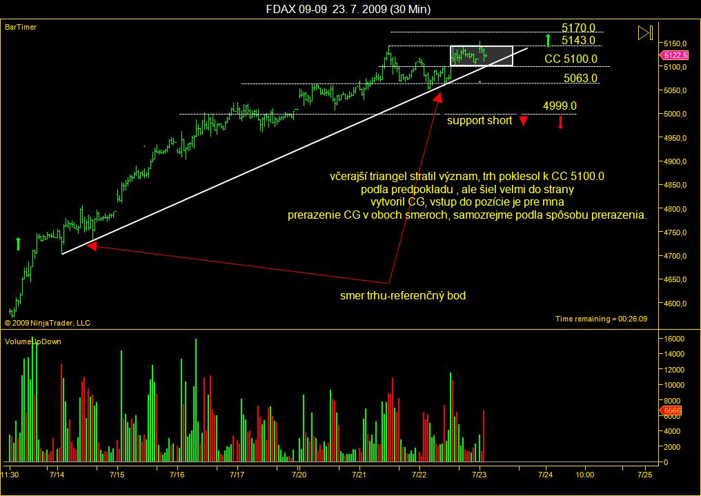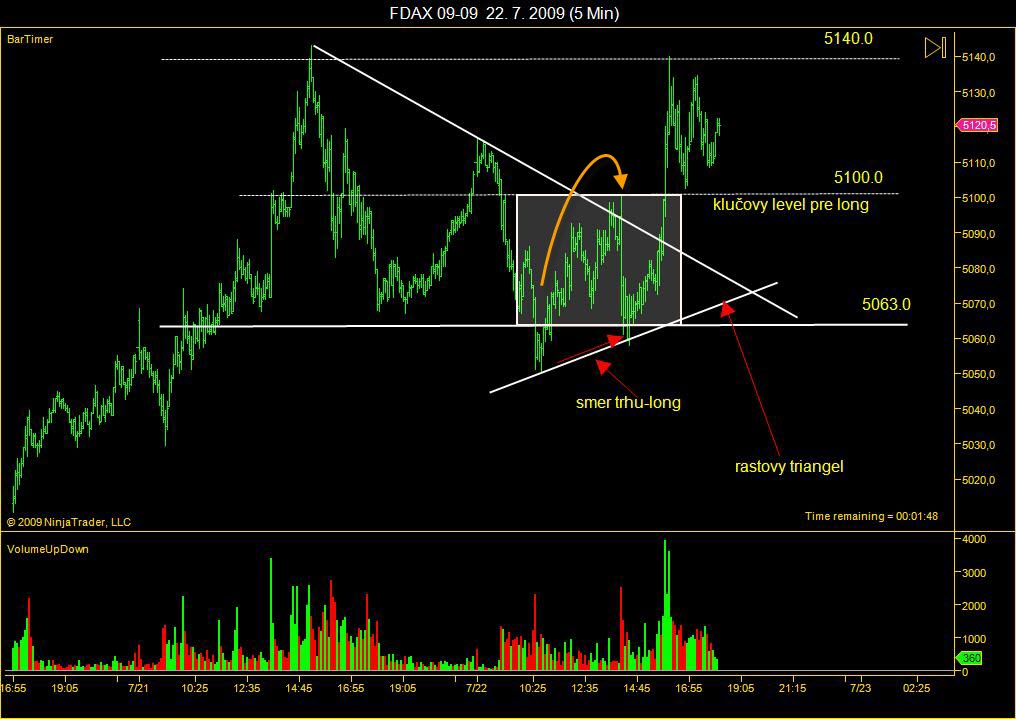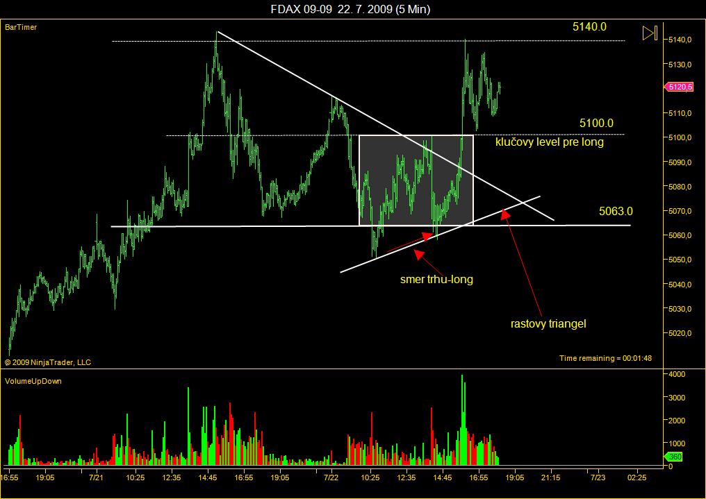 Ahoj Opius, mrzí ma že ti to zatial nejde podla Tvojích predstáv, ale vzhladom na terajší FESX sa ti ani nečudujem lebo je fakt o ničom, ťažko sa číta ...sama Doji usečka a ST uroveň , je velmi nerozhodný . Kašli zatial na to , neobchoduj za každu cenu aby si obchodoval lebo ako vidíš nemá to význam. Zatial si namasti kolieska na kombajne na Tvoju budúcu žatvu... ;) Lapaz, neviem čo myslíš...ten prvý..? nič použitelné som tam nevidel. Už v prvom 30 min grafe ktorý som tu dal ráno mám zaznačenú úroveň 5100 ako klučový level pre long , takže šiel som len podla plánu. Všetko to bolo čitatelné , ale hlavným signálom pre mna bol rastový triangel kde bolo len otázkou času kedy ho cena prerazí , dalej pred prerazením sa vytvorilo range a trh bol stupajuci. Prikladám screeny s bližším vysvetlením. Gladiator028