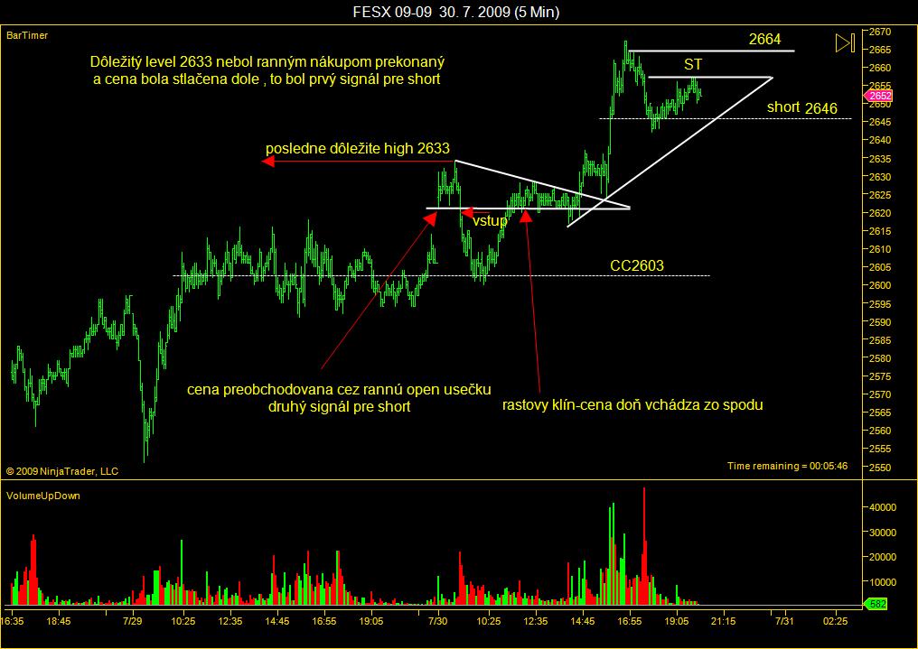 Ahoj Šimi, pozri si screen ako sa dalo vstupiť na cene 2620 pretože cena sa preobchodovala cez ranné open. Pokial chceš urobiť obchod musíš mať pre to dôvod. Okrem všetkých iných možných dôvodov prvý je "vizuálne presvedčenie" . To získaš tak, že ešte pred Open si urobíš úlohu....zakreslíš dôležité línie a vytiahneš ich do stratena , potom ich podla potreby predlžuješ , alebo prekresluješ , ale musíš byť vžy v kontakte s trhom. Nespoliehaj sa na improvizáciu a otázky typu "čo ak? " s takýmto prístupom to nikam nedotiahneš. Otázka Čo ak? patrí tebe nie trhu..... čo ak to tam nepôjde ? mám na další obchod? je to môj posledný pokus? čo ma opravnuje si mysliet že to môže stroskotať? Na to ked si vieš odpovedať tak sa ničoho nemusíš báť lebo poznáš odpoveď a ked niečo poznáš tak z toho nemáš strach. Vždy musíš mat naplánovaný Vstup aj Výstup ! Vopred si nájdi body vstupu a výstupu tak poznáš svoje riziko aj profit a na základe týchto informácii sa vieš správne rozhodnuť. Vždy uvažuj tak že od tebou plánovaneho vstupu musíš vidiet bod kde ta to dostane minimálne na BE , vtedy si už v pohode potom ta zaujíma už len výstup v logickom bode a ten musíš vidieť vopred , lebo žiaden indikátor na svete ti ho neukáže vopred. Viem , že su to otrepané rady , ale možno si ich potreboval pripomenuť.... ;) Gladiator028