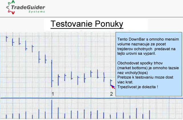 Rad by som sem prilozil prilozil pre ludi co maju problem s prekladom jednu pasaz s vyukoveho Tradeguider produktu 'VSA Bootcamp' je to vlastne preklad toho co hovori Tom Williams o Testing of the Supply. [bold] Testovanie Ponuky[/bold] Ked cena padne do uzemia na lavo kde pred tym bola vysoka pounka(vieme ze ponuka bola vysoka pretoze volume bolo dostatocne vysoke i ked ho mohli absorbovat Smart Money) Nabuduce ked sa cena vrati znova do tejto urovne a Volume je nizke a obzvlast Spread je uzky, tak okamzite vieme ze Ponuka sa vytratila. A pretoze Trh funguje na ponuke a dopyte. Dopyt musi byt vadsi ako Ponuka.