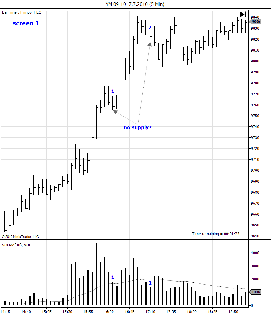 screen 1: to mas docela fuk ci je to test alebo nosupply . pri obchoch vies ze tam Supply je mala . tie co tam mas by som skor ale oznacil prvy ako test a ten druhy takties pretoze tie bary idu do zony toho Up baru na velkom volume ..tym padom ho testuju. takze oba su testy. a myslim ze v uptrende by si mal mat iba testovanie nie no supply . No supply mozes mat v downtrende.