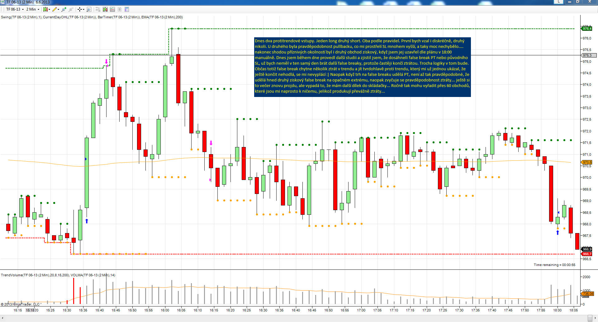 Pánové zdravím vás, pěkně se to zde rozjelo. Je pravdou, že umět si naplánovat kde vstoupím přináší celkové uvolnění. Není třeba celou dobu sledovat každou minutu pohybu na grafu a dá se získat vice důvěry v provedený obchod. Kromě zakreslených úrovní sleduji samozřejmě také daily H/L (tzn celé seance) a aktuální s/r na 5 min. Technika vstupu je samozřejmě závislá na každém, jaké riziko je schopen tolerovat a může pomoci 1,2 minutový graf, RB a případně indikátor stochastic, Williams, macd 1m (RB). Jinak obchoduji NQ, ale jen hlavní obchodní hodiny. Taraka: pokud již máš prokazatelně výdělečný systém, neopouštěl bych ho. Případné filtry lze backtestovat a testovat třeba formou přepnustí na sim mod apod. To ale jistě víš také. Přeji mnoho dalších pěkných obchodů. romanrak