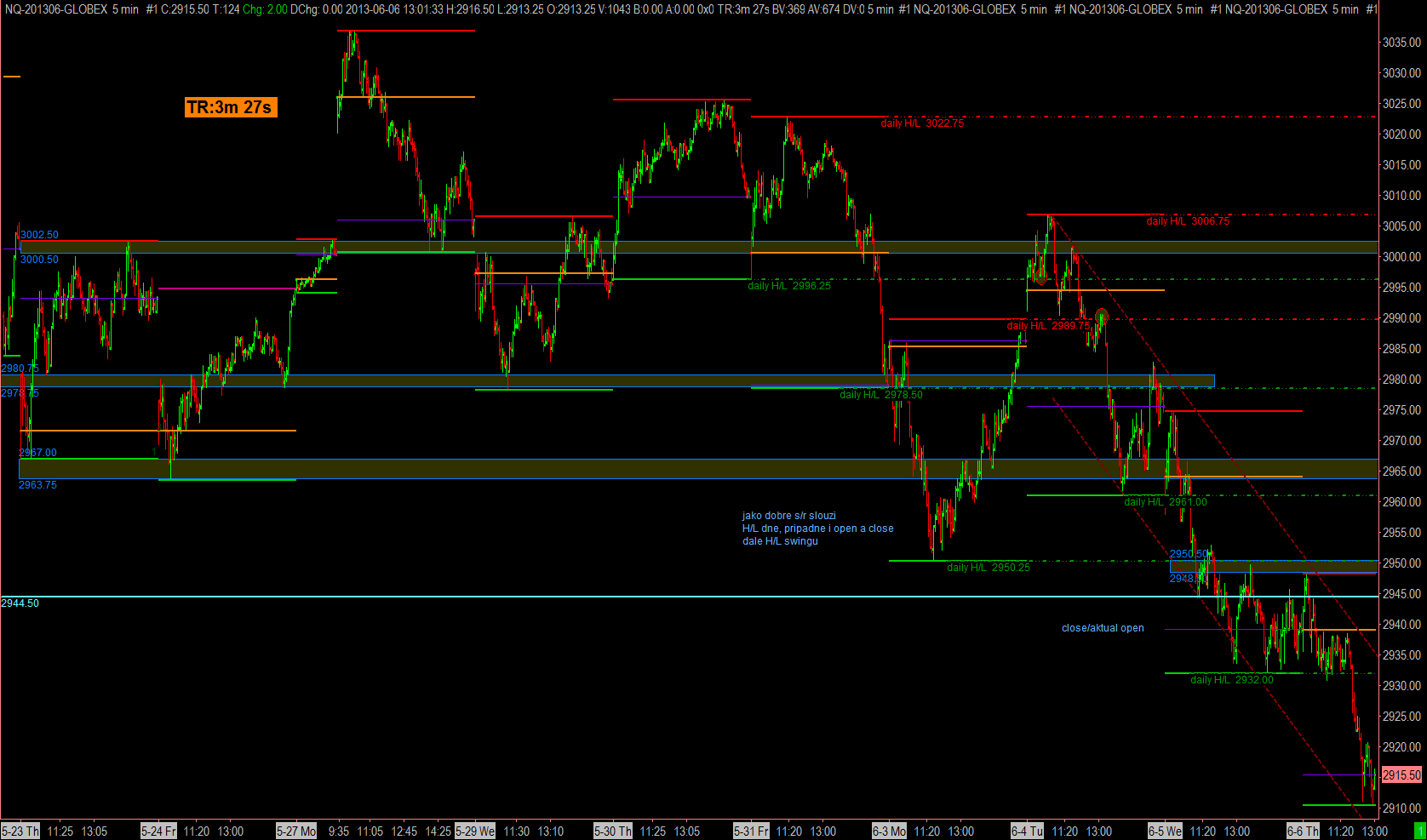 to stranger: k tomu memu vcerejsimu grafu NQ, zaznacoval jsem to pred seanci na 60 min grafu, graf jsem pak na 2 min tf jen prepnul, takze S/R zustaly... ale vcera pri zaznacovani jsem se neridil zadnymi specifickymi pravidly... takze ty S/R byly zaznaceny tak jako od oka... :D coz samozrejme muze a nemusi byt presne ci pouzitelne :) nejaka ta pravidla pro S/R budu muset sesmolit, at to nedopadne tak, ze to budu mit na stejnem grafu s odstupem casu pokazde jinak :D