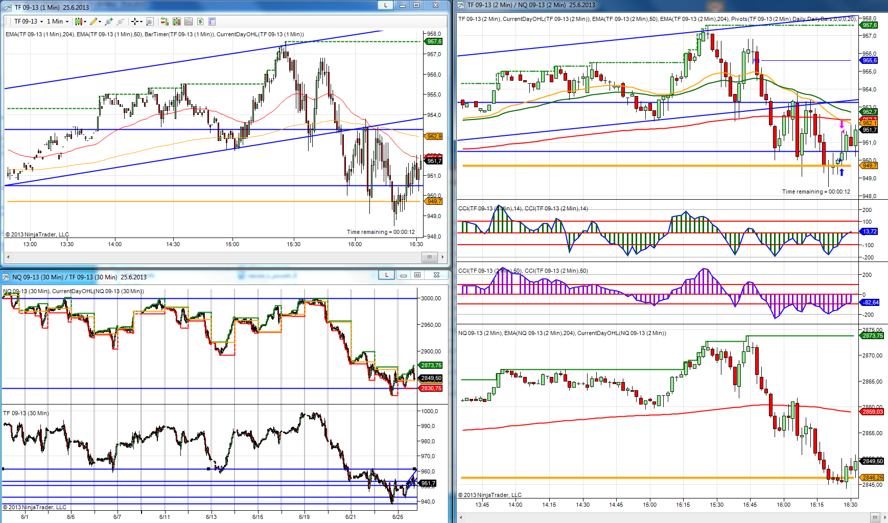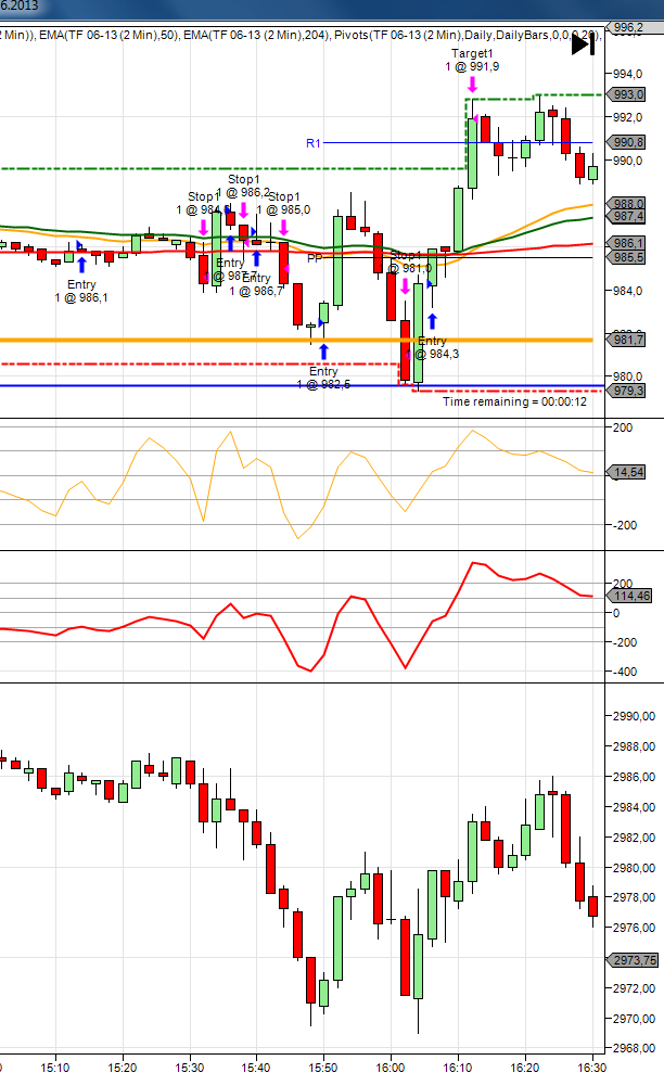 to icm, ja som len nerozumel z príspevku /emini II nemám prístup/ o aký Open sa uvažovalo, 15:30 to určite nebol a 6:00 mi tiež nepripadá relevantné preto som sa pýtal a keď som sa pozrel na 25.6.2013 TF 09-13 o 6:00 hod bola cena okolo 944 a na Vašom grafe je naznačený odraz / orange linka / od 949,7 takže niečo tu nesedí a ja tam vidím stále len odraz od Close /uzavretie gapu/ a pokračovanie Up trendu po otočke, ktorý je pekne vidieť na 30mintf. Odraz od Close vyšiel včera aj dnes tak si to začnem viacej všímať. Možno sa mýlim, ale niečo mi tu nesedí a neviem ako mate nastavený graf.