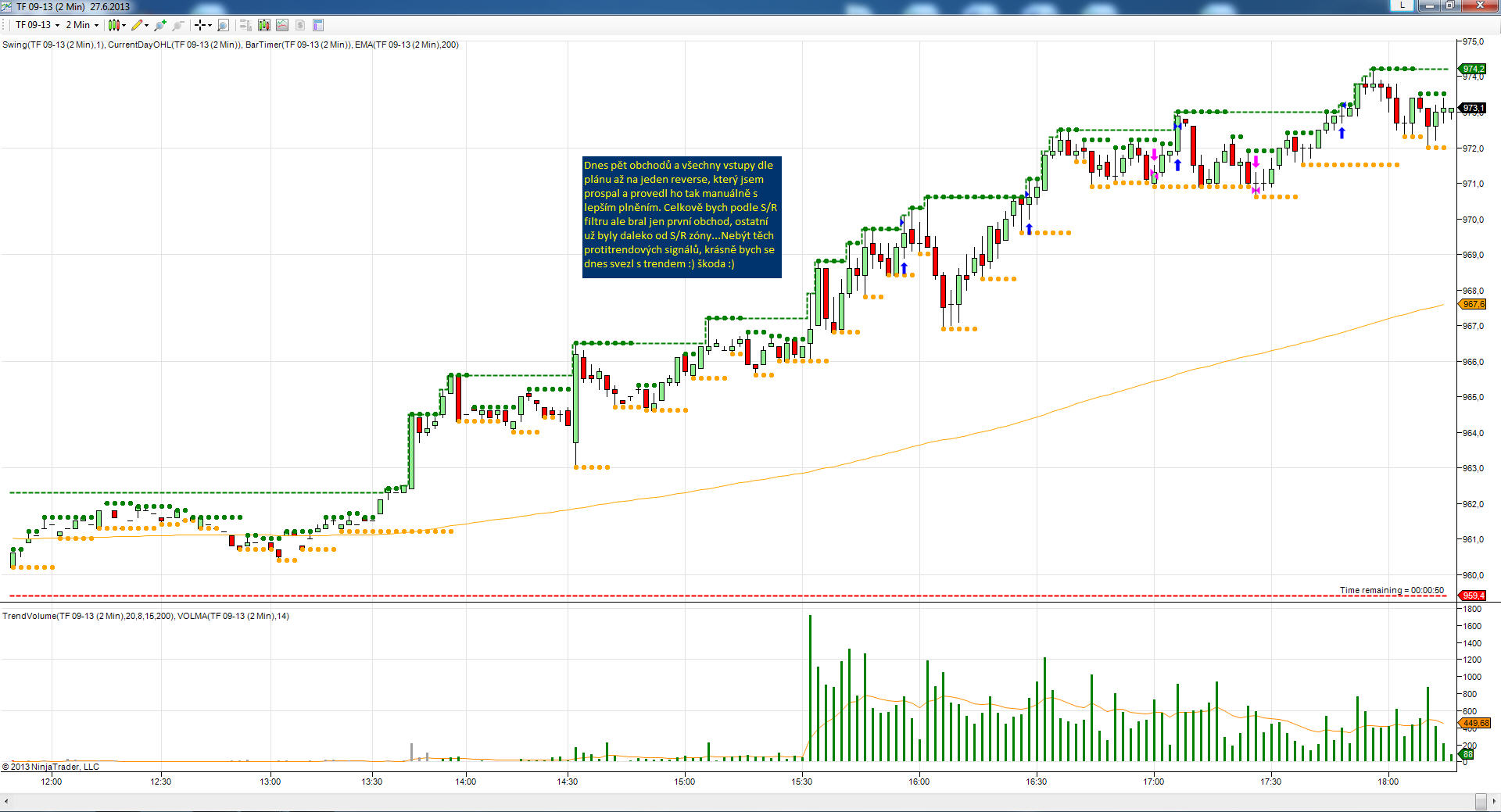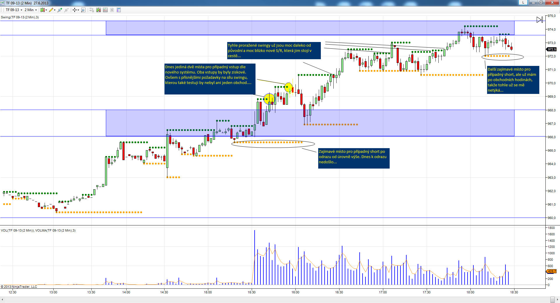 Tak přece jen sem vložím screen pro Taraku pro inspiraci. Tam, kde popisuješ, že bys dal vstupy, přijde mi to u obou dvou případů stejně vysoko z hlediska rizika, proč? Mrkni na screen, byl tam trendový kanál a od trendového kanálu se očekávají poklesy (které se taky děly, s naše SL 15tic. by byly vypleněny), je lepší nastupovat na spodní hraně kanálu, což můžeš na screenu pěkně vidět, jak se dnes vyplnilo (i s našim SL 15 ticků), navíc podpořeno FinWinem a IMA s NQ