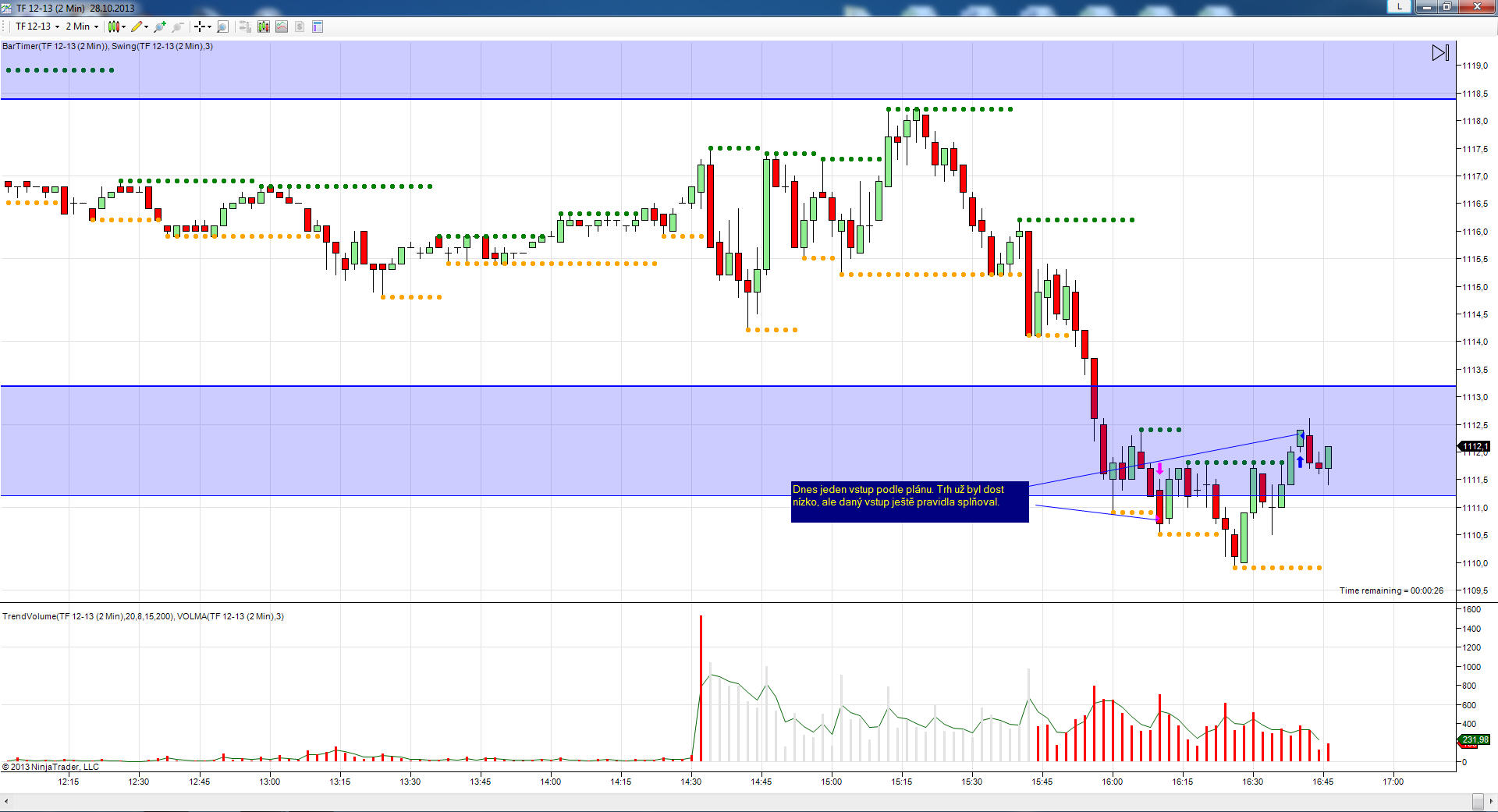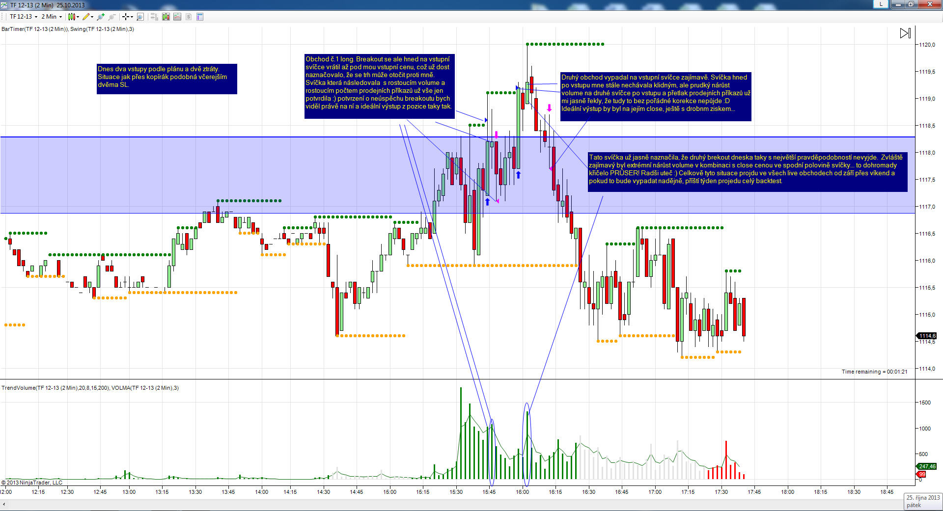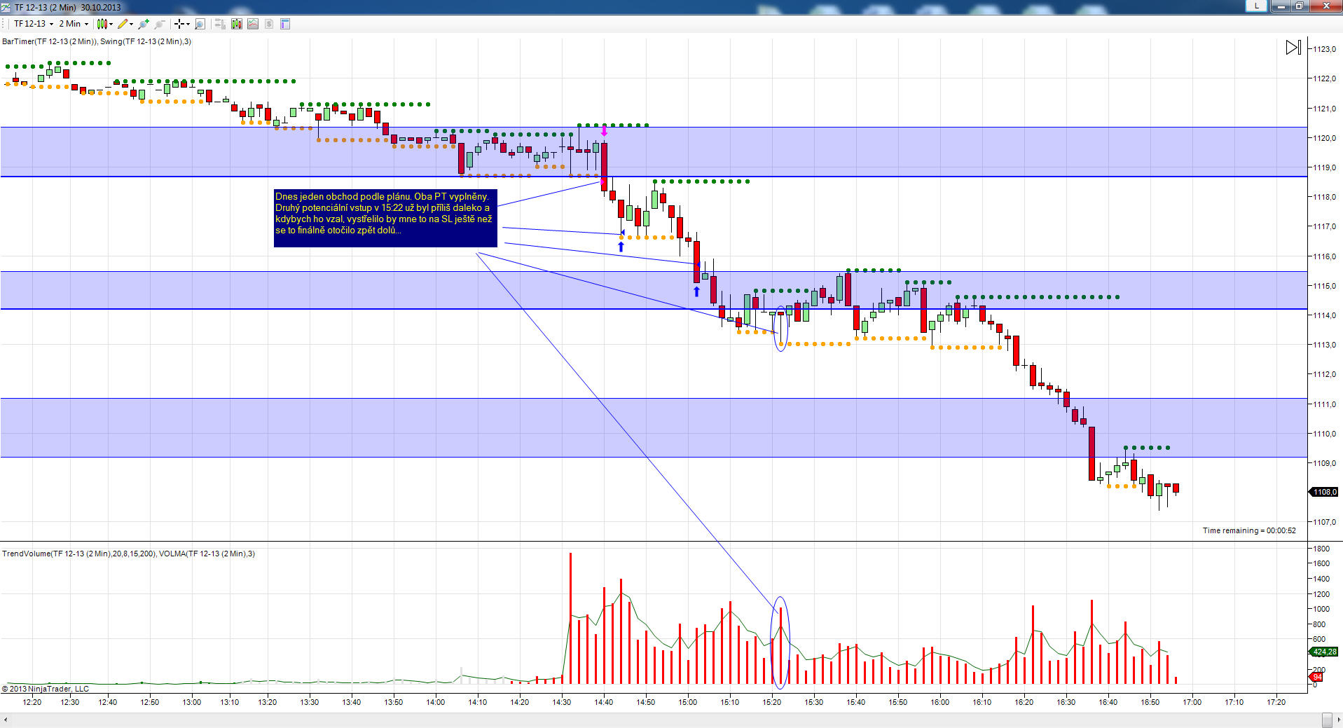 dneska jsem sledoval Nasdaq a tam po prvním obratu bylo "zřejmé", že se trh obchoduje v rozpětí, ty jsi zase naskočil na průraz denního rozpětí z jehož high po open se vytvořil krátkodobý downtrend, aby tě zmátl, že trend bude pokračovat a prorazí S/R zónu a půjde dále ve směru průrazu, toto je špatně, neber to, že ti chci radit, ale zase jsi šel s pistolí na medvěda vzdáleného několik desítek metrů, nebo jsi se pokoušel zabít divoké prase z ostřelovací pušky na 5-10 metrů... :), nenech se ukolébat tím, že je to podle plánu, špatně jsi přečetl trh, já jsem včera dělal statistiku svých obchodů za srpen a září a tam jsem naprosto vystřízlivěl, obchodoval jsem nesmysly, protože jsem nedokázal správně určit charakter daného trhu, v tom, že dám pod nebo nad S/R zónu přikaz pro průraz swingu není žádný edge, když nedokážeš správně rozeznat charakter trhu...