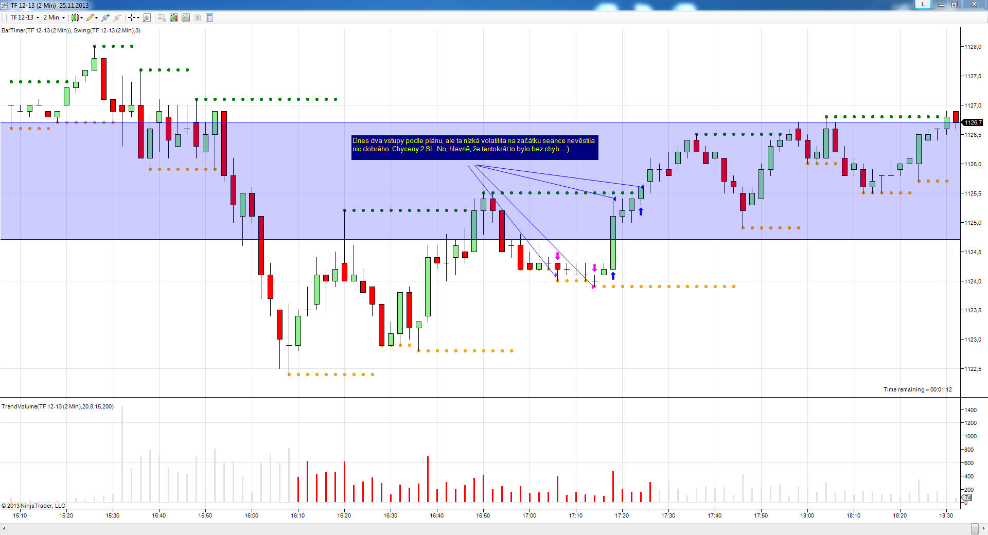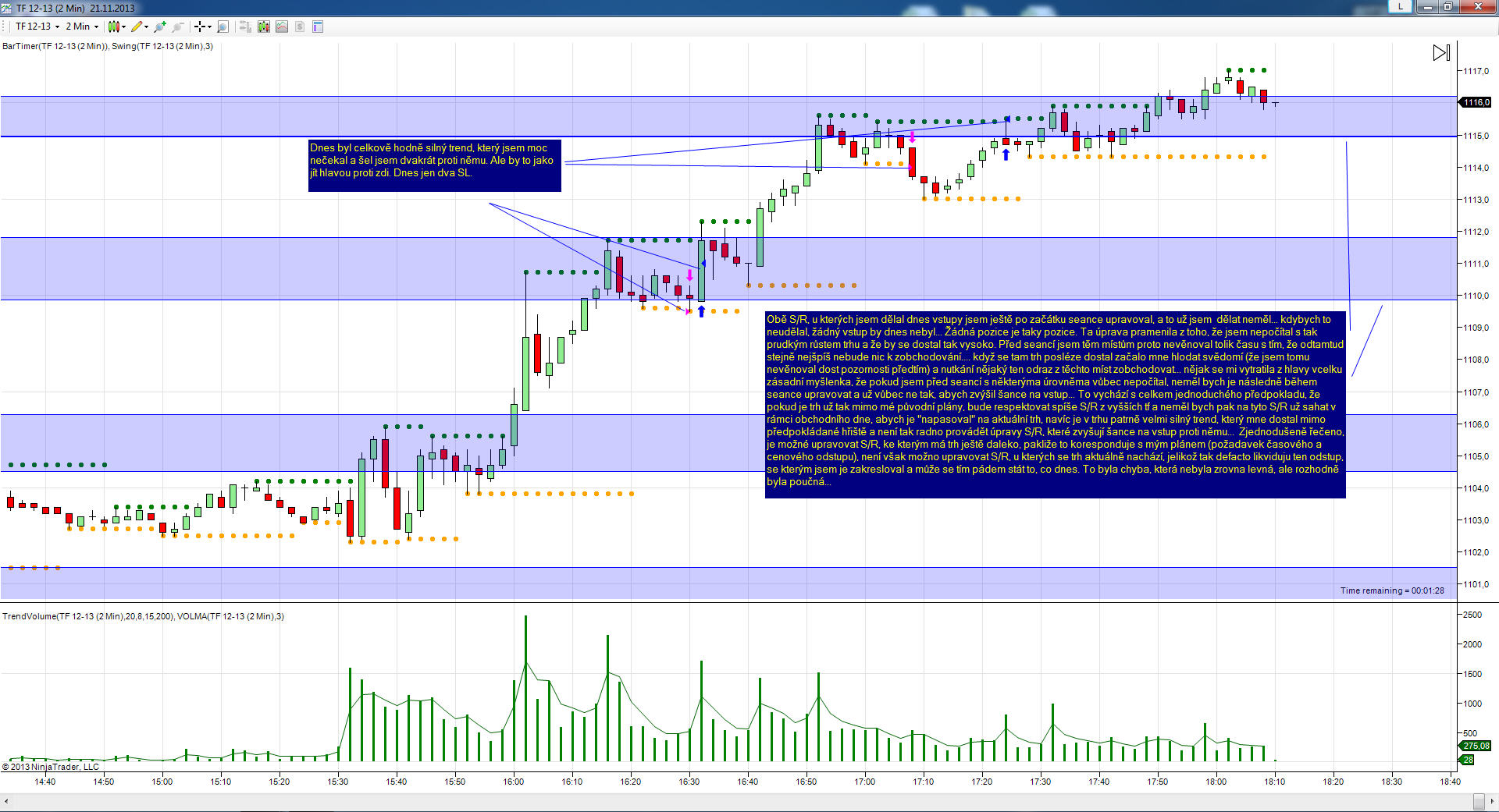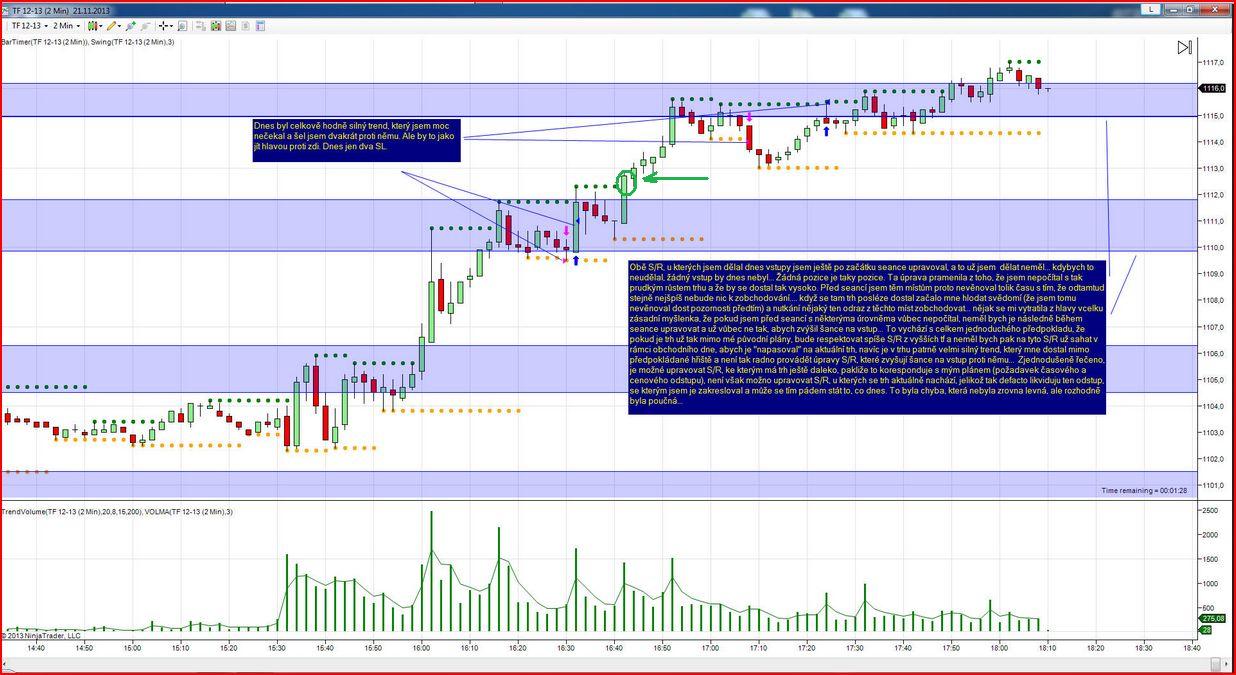 to ludekM: kdyz mrknes, kde trh oteviral (nekde u 1103) a kde prisel ten jinak platny signal (az za 1112), zjistits ze trh uz ustrelil docela slusnou vzdalenost do longu, ktera rozhodne neni uplne bezna... ve vetsine pripadu se ti nevyplati brat vstupy takhle daleko od open do stejneho smeru, protoze se trh uz chysta otocit... v pravidlech proto mam, ze tak vzdaleny vstup od open do stejneho smeru uz neberu... ale je pravda, ze vcera v tom silnem trendu by to asi nakonec bylo rozumnejsi nez vstupy, ktere jsem udelal proti nemu :D