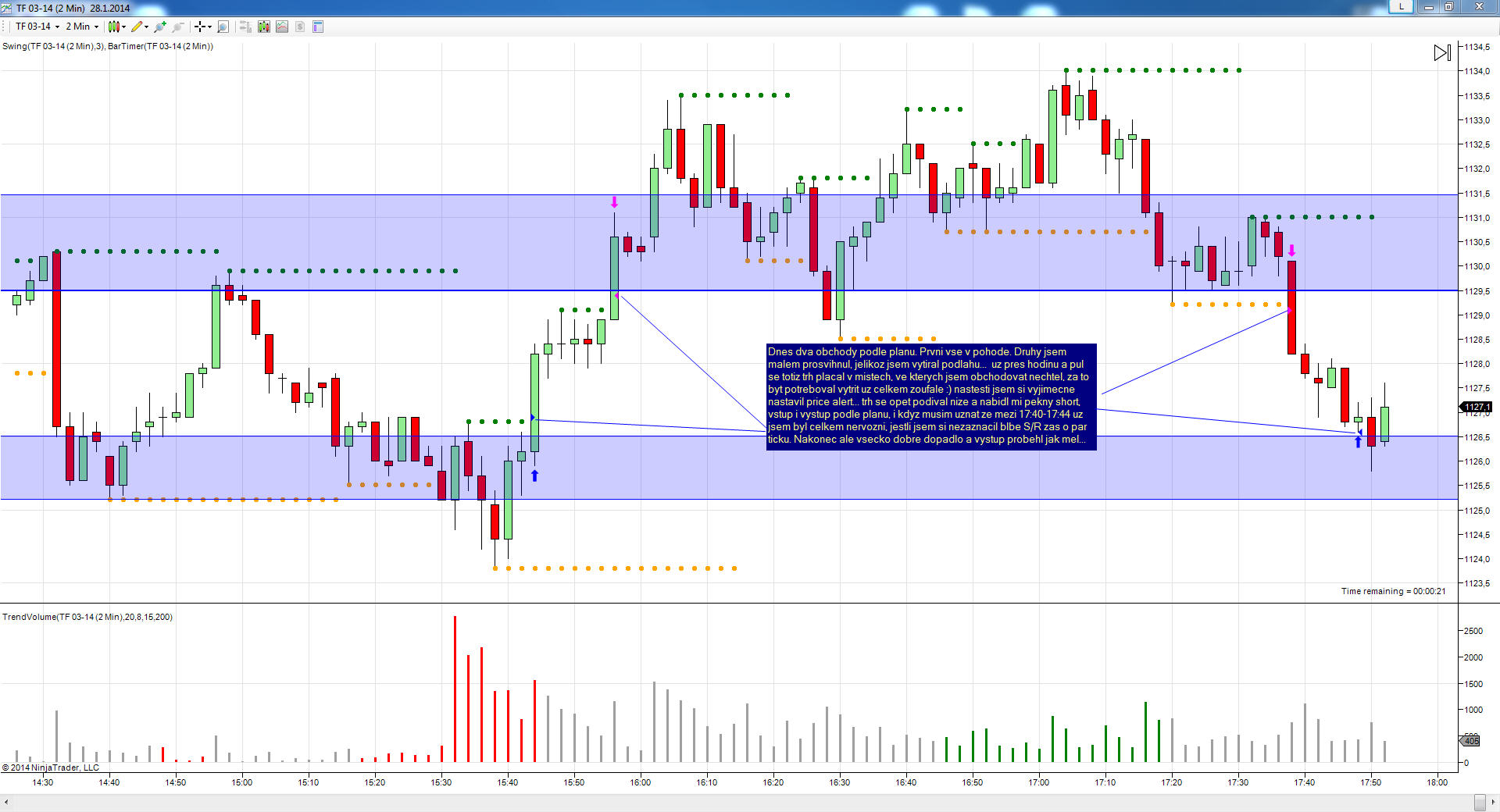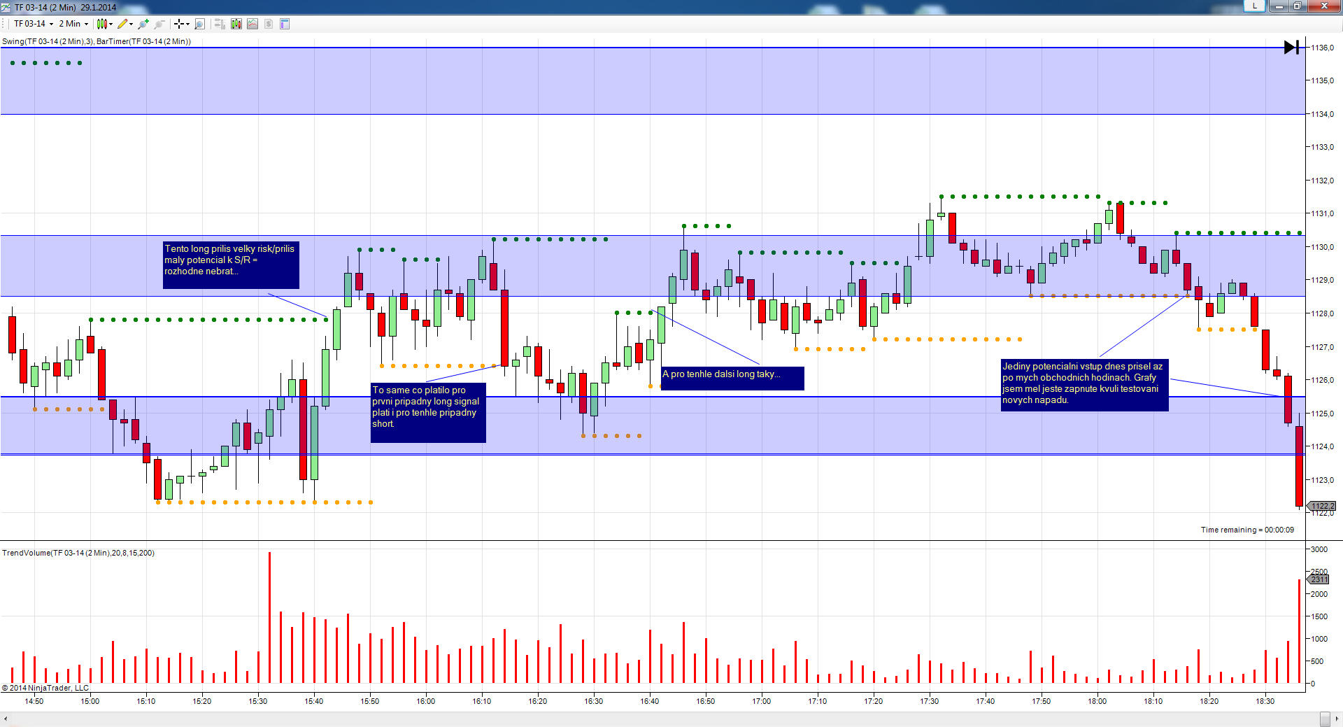 to cipinek: ahoj, v lednu mam zatim jen 15 live obchodu a system jsem od zari moc nemenil, jedina zmena jsou rozdilne SL (coz se ale netyka vstupu samotnych)... mimo trh mne drzi spis fakt, ze se mi nevytvareji swingy v dostatecne blizkosti S/R urovni, ktere si zakresluju pred seanci... a brat prurazy swingu daleko od S/R nebo prilis blizko S/R ktera je v ceste, je pomerne riskantni zalezitost... atualni system ma v prumeru 15-25 obchodu za mesic, jen zridka ma vice, i proto hledam alternativni zpusoby vstupu, ktere bych do systemu pridal :) ale testovani jde pomalu, zvlast kdyz napadu je spousta, casu malo a jen malo z tech napadu k necemu vazne je :) ;) prikladam dnesni screenshot bez obchodu, abys videl, proc jsem neobchodoval... pripadne dotazy rad zodpovim :) jinaaaac preju hodne stesti :)