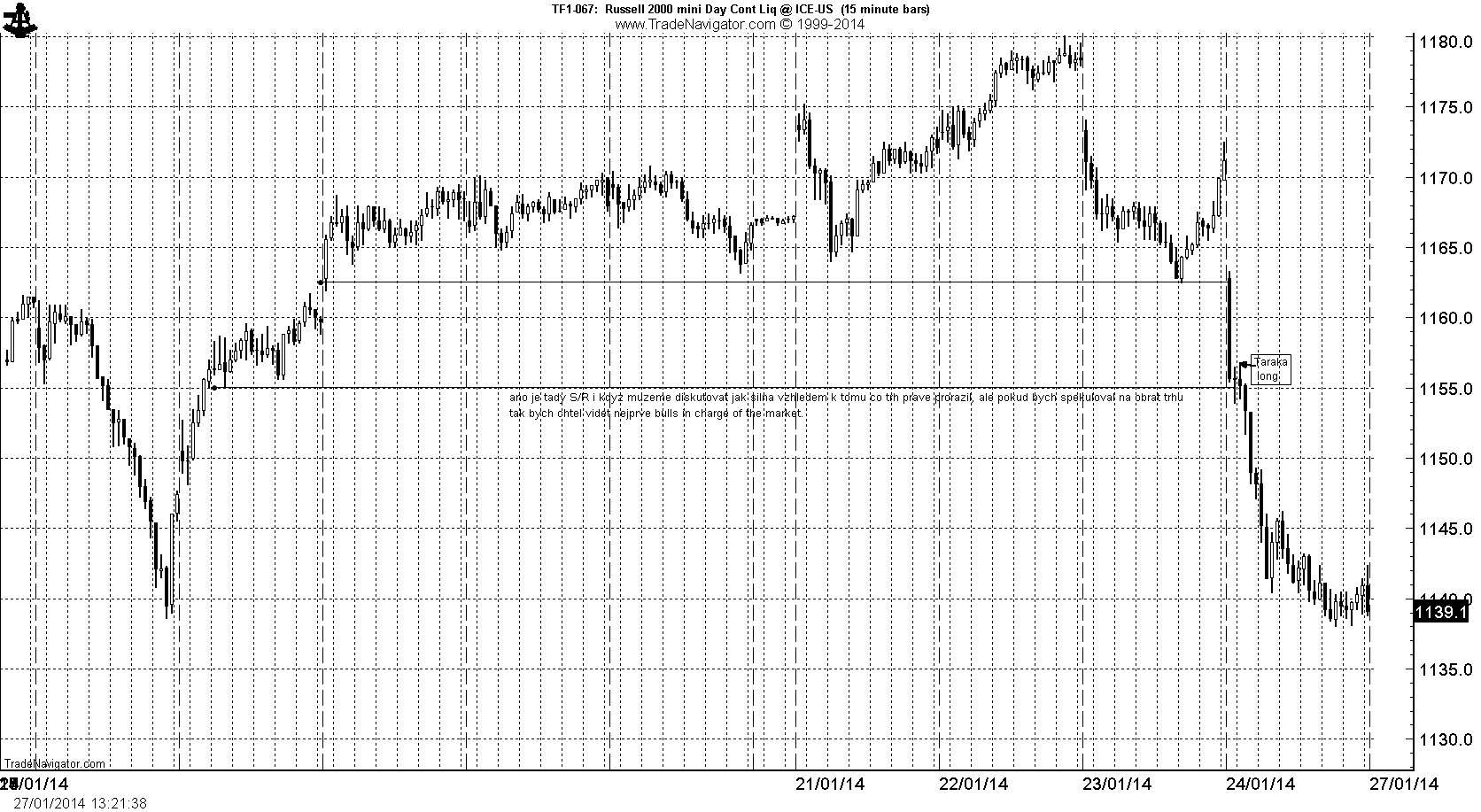 trendfinder: chci reagovat na pruraz swingu o kterem ste se zminil, kdyz Taraka vzal long protitrendovy obchod. Prorazeni swingu je az po prorazeni a uzavreni bar nad swing, ne pouze otestovani !! (pokud se neco otestuje ale neprorazi tak swing prece nevznikl. Prilis casto se trh riti k high jenom, aby se otocil a naopak utika k low jenom aby se otocil a porad dokola vetsina prurazu se nepodari. Nicmene v tomto pripade: .......pohyb dolu byl silny a prorazil silny support minuleho tydne, takze se nabavime o pokracovani 2 sided trading, kde ocekavame, ze trh zase pujde nahoru tak jako nekolikrat udelal minuli tyden (viz graf) Jit do long position po takovem pohybu dolu a prurazu last week support, tak potrebuji videt, ze bulls nejprve ukazi dostatecnou silu prorazit a pote i dostatecnou silu odrazit bears pri testu previous low a naslednem (higher low) a nekde v tomto procesu se naskytne prilesitost ke scalpu, coz je, obchod s velkou (vetsi) pravdepodobnosti a maleho sl (jak vsichni vime:) Kdyz se koukam na grafy a vstupy od Taraka, tak Taraka bere swing obchody (kde se pouzivaji vetsi sl kvuli korekcim trhu), ale pouziva v obchode SL jako u scalpu (kde se korekce neocekava). Scalp musi mit velkou pravdepodobnost pohybu nasim smerem, aby nevznikla korekce a nebyl zasazen sl, ktery je velmi blizko. Brat obchod na high of 2 sided market for last 13 bars a ocekavat vetsi pravdepodobnost v prorazeni resistance se sl, ktery nedava prostor ke korekci, je ztratove na 5 min grafu, ktery obchoduji. Scalp v tomto pripade byl koupit low bear bar 16:02 coz vsichni delali a prodavali 16:10 jako scalp dolu, ze ktereho se stal swing trade. Bohuzel obchody, ktere maji nejvetsi pravdepodobnost maji i nejvetsi SL a jsou nejtezsi vzit 15:36 low nothing is perfect, but good enough:) a chvili trva nez si na to clovek zvykne.