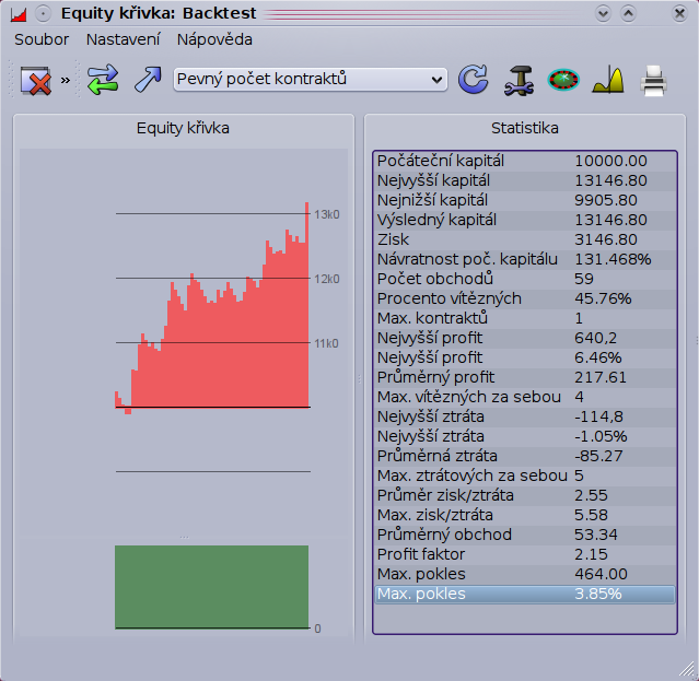 To tedy znamená, že pokud se nám nebude zrovna dařit a budeme zažívat ztrátovou sérii, budeme riskovat pouze 3,25 % equity (což velmi blízko odpovídá doporučené hodnotě neriskovat nikdy více jak 3 % na obchod), a pokud se nám zrovna dařit bude, pozice bude dvojnásobná, což nás sice vystaví vyššímu riziku, avšak většinou v době, kdy jsou k tomu příznivé okolnosti. Pojďme se podívat na výsledek:
