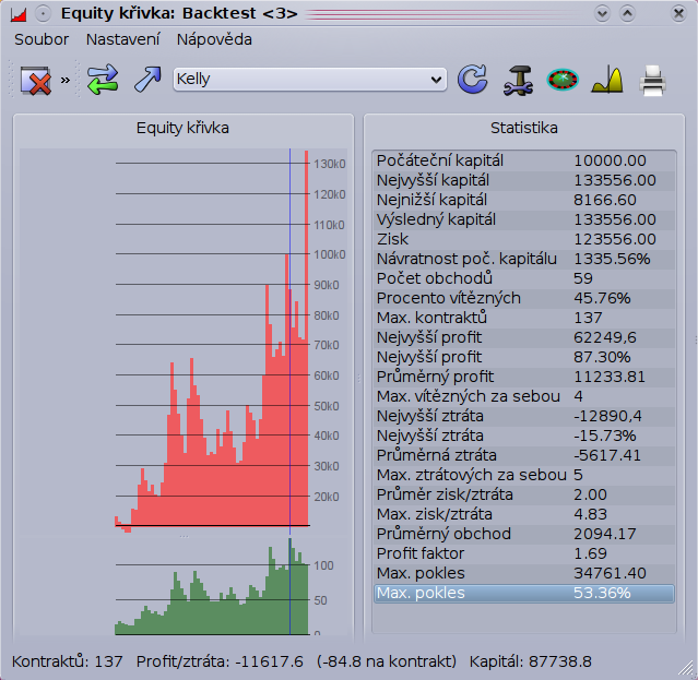 To MNovak: S tim DD je to složité - když obchodujete "bezpečně", je drawdown malý, zisky ale taky nic moc. Jakmile začnete investovat do každého obchodu více, vyděláte mnohem, mnohem více, ale DD taky stojí za to. Přiložil jsem tři obrázky - tři různé strategie PS. Drawdown je v tabulce s přehledem úplně na konci, zvýrazněný. 1. obrázek - obchodování s jedním kontraktem. Zisk 31%, drawdown 3.85% 2. obrázek - obchodování s pevným riskem do 3.5% (průměrná ztráta 100USD). Zisk 183%, drawdown 16.3%. 3. obrázek - obchodování dle Kellyho rovnice (pevný risk 11.7%). Zisk 1235%, drawdown 53%. A to je tento použitá pouze poloviční výška rizika oproti zhruba 23%, které doporučuje Kellyho rovnice pro tuto strategii (ale to není na závadu, naopak). To by pak byl zisk 1833% a DD 72%. Obchodování dle Kellyho je pro extremisty. Já bych se chtěl dostat do stavu, kdy budu schopen obchodovat strategii PS podle druhého obrázku - DD mi vychází zhruba od 10 do 30% a je to v pořádku. Při použité strategii a způsobu PS to tak prostě má být. V tomto kšeftu jde zisk ruku v ruce s drawdownem. Uvědomuju si ale, jak jednoduché je napsat "DD 30% je OK" a jak těžké je pak zoufale koukat na EQ křivku a říkat si "Co dělám špatně, že mi zmizela třetina peněz?"
