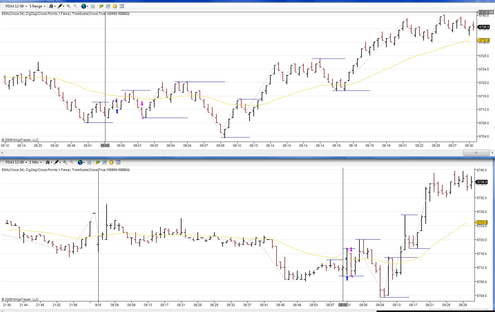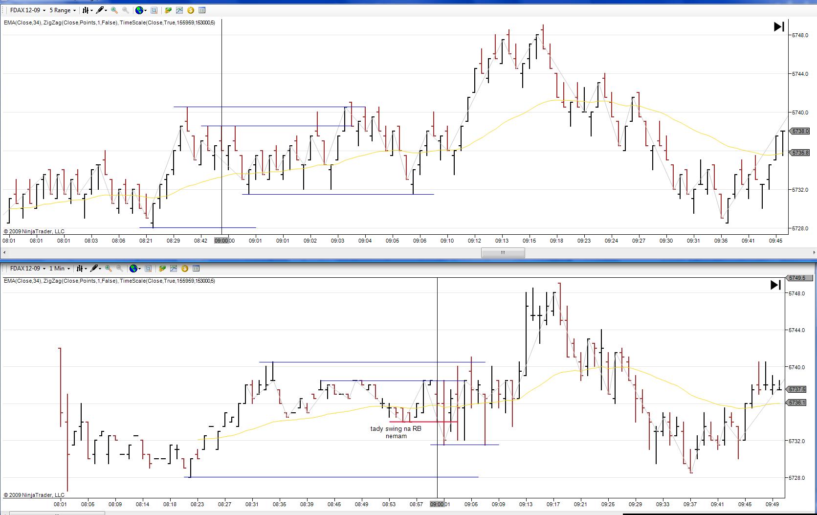 bergmann1: prikladam dva obrazky, porovnani RB5 a 1TF, jak uvidis je to hodne podobne, preci jenom na obou grafech se pohybuje jedna a ta sama cena. Takze si stejne musis udelat svuj backtest na minutovem TF, ale strategie prurazu prvniho swingu by tam mela take fungovat. Lada