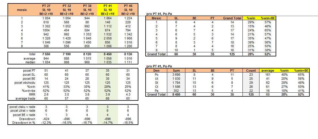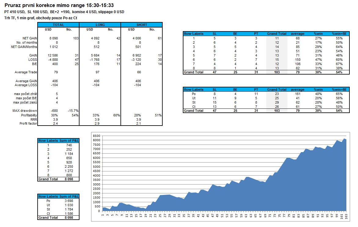 Pavel K: tak jsem si otestoval tvuj system na TF a jsem spokojeny. System funguje pekne se stejnym nastavenim na obe strany. Jinak patek mam take ziskovy, ale neco kolem 300 za 8 mesicu, takze jsem ho nakonec take vynechal. Jinak filtrovani tam nemam skoro zadne, jenom korekce se nesmi vratit do range. Napr. pro smer long, nesmi nejnizsi high korekce byt pod horni linkou range. V tom pripade cekam na druhou korekce. Doufam, ze je to srozumitelne, kdyby ne, tak muzu pridat obrazek. Vysledky - na prvnim obrazku je porovnani ruznych profit targetu a na druhem jsou vysledky pro PT 410 USD, 4 dny v tydnu. Vse pouze pri jednom obchode v rozmezi 15:34 az 15:59. Takze diky za inspiraci, vypada to dost dobre, navic i behem srpna, coz nebyl nic moc mesic na mem stavajicim systemu. Ale zari zatim nic moc, ale do konce mesice je jeste casu dost, takze je predcasne hodnotit. Lada