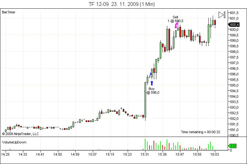 jelikoz ja obchoduji jenom prvni pulhodinu, tak si v pripade takovehoto trendu udelam cervenou caru 6.5 bodu od low a pokud je trh uz nad ni, tak zapominam na trendove vstupy. Russell se v prvni hodce hybe v prumeru kolem 8.5 bodu, takze pokud bych vstupoval vyse, tak uz mam malou sanci, ze se dostanu aspon na BE (ja mam posun po 2 bodech). Sanci na vstup bych mel v 15:41, ale jelikoz uz trh byl nad carou, tak jsem vypustil a byl by SL.