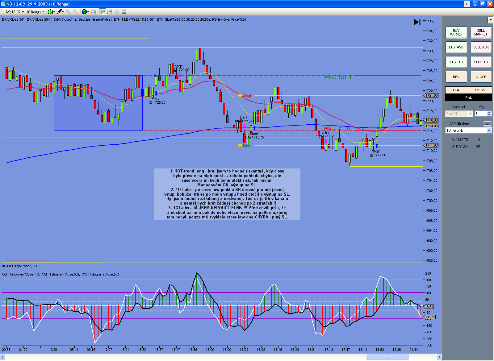 Zdravím všechny, tak se taky přidám s dnešním obchodem na NQ. Jedu RB10 a po delší době opět plnej PT. Fakt ale je, že jsem se na takových obchodech už víckrát spálil. Trh byl v cenovém kanálu, potenciál pro obchod k low včerejšího dne byl na hraně, ale trh měl dynamiku po negativních makrech, tak jsem to vzal. Aby tady ale nebyly jen samé screeny s hezkýma profitama, tak sem dávám i můj včerejší den, kdy jsem nasekal 3 plné SL. To ani nebudu nijak komentovat, pořád se to tady píše dokola, že psychika je nejdůležitěší a stejně člověk ty chyby stále dělá. No mám se ještě dost co učit... Jarda