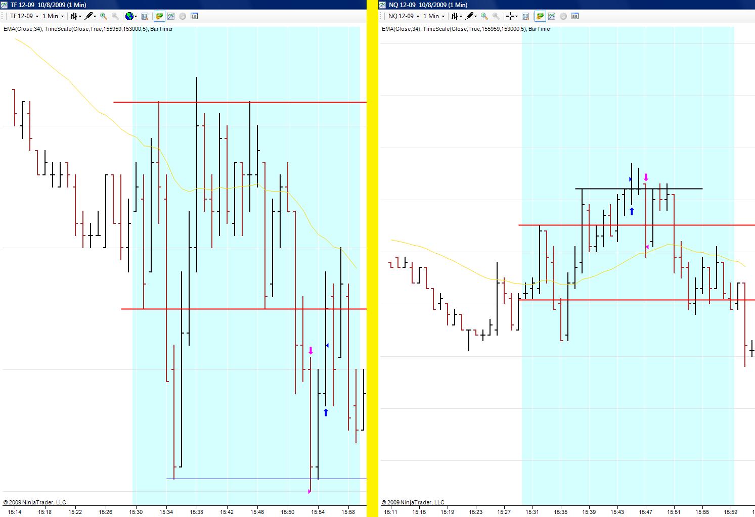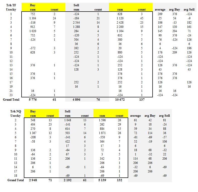 majkll: spatne to rozhodne neberu, diverzifikace to neni, to by bylo silne slovo. Tento tyden, krome vcerejska oba trhy davaly stejne nebo aspon hodne podobne vstupy. Neni to ani PS, ten zacnu az od listopadu. Ani vlastne nevim, co to je. Spis takovy zkusebni provoz. NQ jsem nikdy neobchodoval, tak ho spis jen zkousim, protoze system je jednoduchy a da se to zvladat, tak spis zkousim, co to udela. NQ dava rovnomernejsi vysledky v prubehu mesicu nez TF, je tam velmi nizky risk, ale TF je zase celkove ziskovejsi. Takze prednost bych dal NQ, ale TF uz obchoduji pres rok, tak se mi z nej nechce jen tak odejit. Budu to muset nejak vyresit do konce mesice, ale zatim nevim. lapaz: nakonec jsem otestoval, ze proste beru pruraz prvni korekce. Takze kdyby se to otocilo dolu, tak prikaz bych mel nachystany 1 tick pod nejspodnejsi cervenou carou, takze bych vstupoval na 3. fialove usecce zprava. Nazorny priklad viz vcerejsi screen. Testoval jsem to takto, mozna jina varianta v techto pripadech muze byt ziskovejsi, ale ja to chtel mit jednoduchsi. Sam jsem se dival jenom na pocet usecek, ktere se vytvori od zacatku korekce do vstupu a tam ty vysoka cisla nevysly nijak spatne a navic maly pocet obchodu nedovoluje delat nejake zavery, tak uvidim casem - opet viz screen. Prostor pro zlepseni je urcite velky, ale ja zatim davam prednost jednoduchosti, tak uvidim, jak to dopadne. Lada