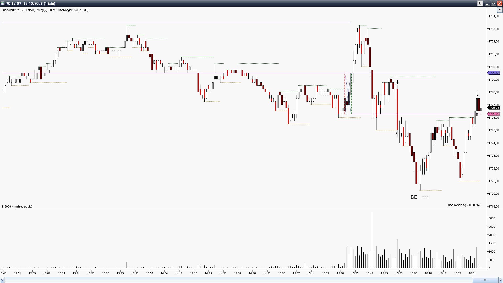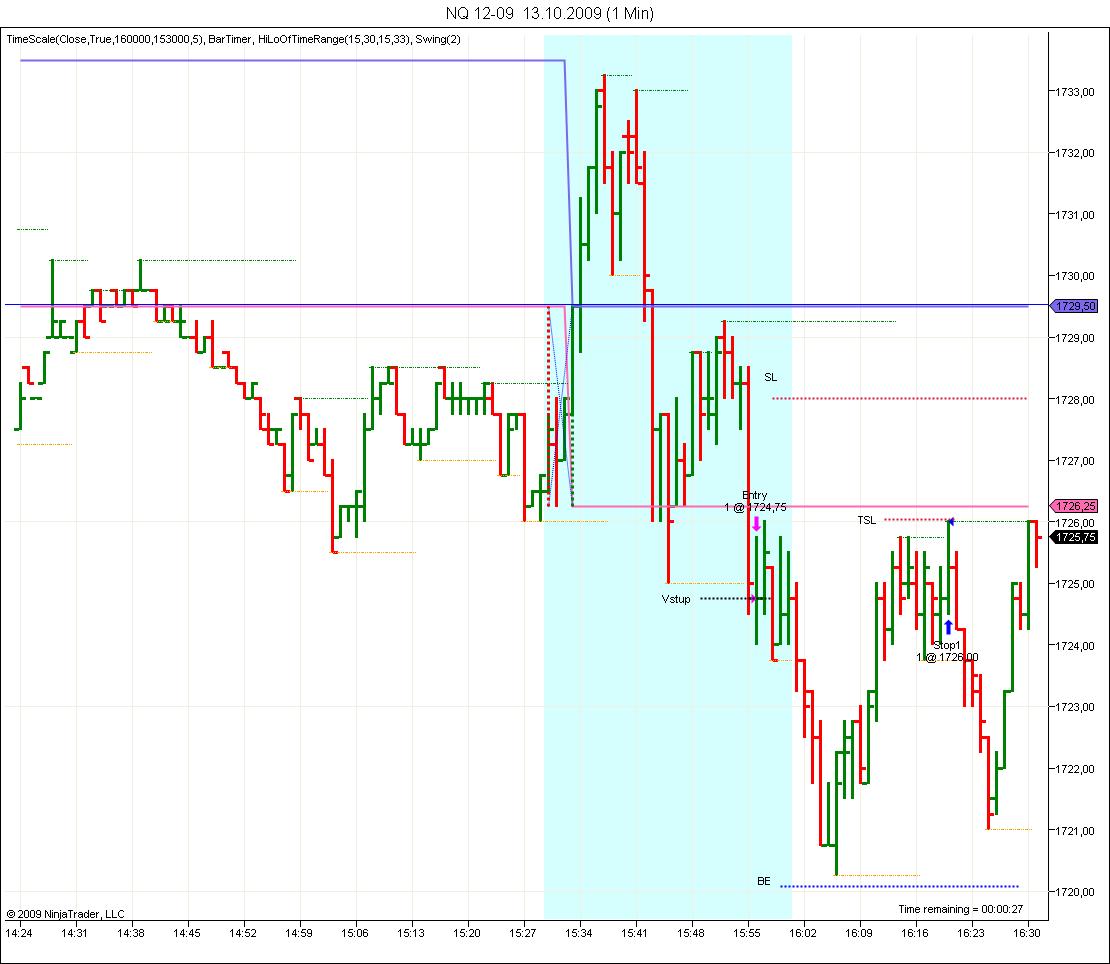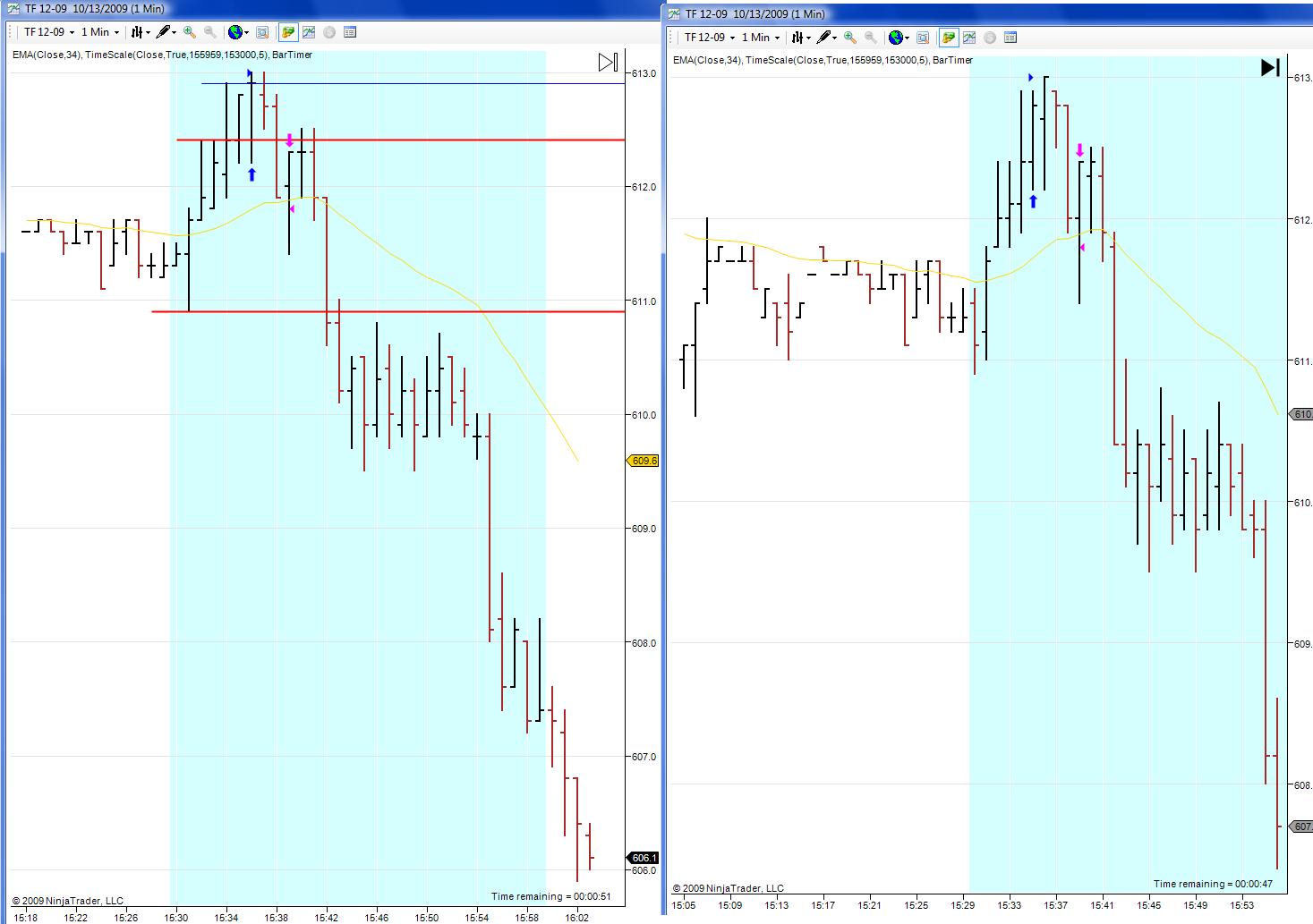 Zdravim, gratuluji vsem k profitum. Ja k nim dneska prispel, na TF jsem koupil presne high. To by me vubec nevadilo, byl to vstup podle planu. Ale kdyz jsem tady pak cetl, jak se to pekne rozjelo, tak jsem se podival znovu na graf a podle noveho grafu jsem mel mit plny PT, protoze podle nej se mi ukazal naopak vstup do shortu a puvodni korekce tam nebyla. Porovnani viz screen. No dalsi zaludnost NJ, netusil jsem, ze minutove grafy muzou lisit. Asi nejaka chyba pri vykreslovani grafu pri zivem obchodovani. Snad se to s verzi 7 zlepsi. A me ted vznikla pekna dira mezi backtestem a realnym obchodovanim. Jinak dnes pekny pohyb, tak uvidime, co se bude dit dal. sd77: pekne vysledky, jsou hodne podobne 1. korekci. Ted uz muzu poprat jenom hodne discipliny a at se dari system obchodovat bez chyb. Kotas: ted jsem neco hledal a vsimnul jsem si toho dotazu na vstupni prikaz. Ja vstupuji se stoplimitem, mam nastavene max slippage 2 ticky. Zatim mi trhy vzaly vsechny prikazy a co je zajimave, tak lepsi plneni mam na TF. Na TF zatim max. 1 tick slippage, na NQ uz jsem mel parkrat ty 2. Lada