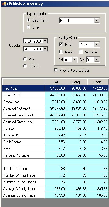 2 Kotas : Tak logicky... pokud obchodujes jen system SL/PT, tak pri SL100 a PT300 budes mit RRR 3 a pri SL60 bude RRR 5. To ale pro urceni profitable system neni to nejdulezitejsi, je to jenom pomer zisku k risku. Dulezity je profit faktor, a ten bude pri 60/300, 24 win a 53 lose imho velmi maly. Tzn. je to podle mne neobchodovatelne. Pro predstavu jake strategie stavim ja, prikladam screen jedne z nich. Strategie je jiz dvakrat orezana tzn. vysledky uz jsou dostatecne "znehodnoceny" a stale to prochazim, jestli skutecne vse sedi podle OP. Je to take breakout system. (Jen oprava : je to za 01-09/2009, TFko, Vol700)