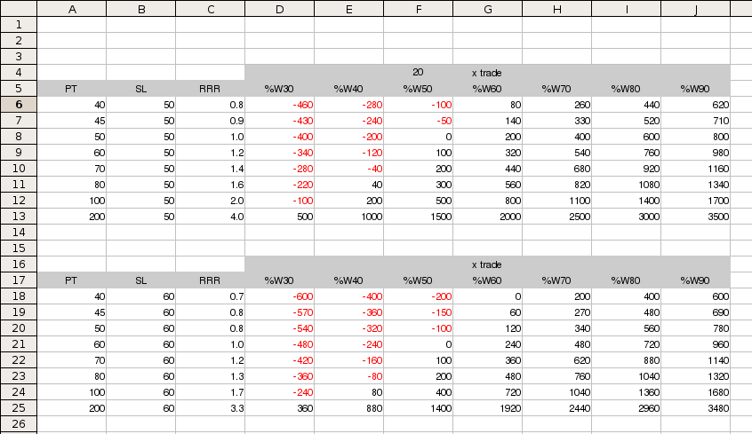 zdravim, davam k lepsimu teoretickou tabulecku, kde pro dane fixni SL a PT (a jejich pomer) je spocitane pri ruznych uspesnostech jake dava vysledky po 20ti obchodech je z toho treba videt jake minimalne win musim dosahnout abych byl v plusu a lze se motivovat k dosahovani lepsiho win:) vychazim z toho ze v paperu si tak nejak overime jake %win mame. ja treba vcerte ruznych pokusu i navalu silenosti mam asi 40% kuzmic: dovolim si odpovedet za altera:) nikoliv linearni to neni, jen vetsi pohyby maji mensi prpst. jakou konkretne to tak nejak spis nevime:) ale pro zminene RR staci tech 30% win aby nebylo v minusu, pokud to dobre chapu:) ne?