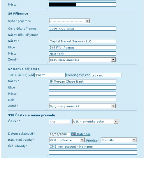 Taky bych chtěl fundovat účet u CMS LLC přes Servis 24 ČS a.s., žádost schválena, ale při své nejlepší vůli, když koukám na pole zahraničního platebního styku, není mi jasné, jak mám explicitně naznačit že J.P.Morgan AG, Frankfurt, Germany je korespondenční banka, taky nevidím pole, kde bych napsal SWIFT té banky, a nerad bych své peníze vyslal na pouhý výlet za nemalé cestovné :-) a na přepážku mě po zkušenostech a dojmech z jejich ceníku nikdo nedostane :-) Pokud tedy někdo čerstvě přes Servis 24 (a samozřejmě úspěšně) fundoval svůj účet, prosím jej tímto o radu!