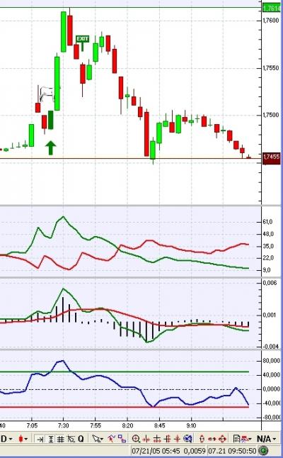 To Dzink Reakce na Greenspena byla vskutku zajímavá..:-), pokles - vzestup a nyní zase zpět..I když nejsem velký příznivec TA, spustilo mi to na pěti párech "nechtěně" :) na účtu s VT jeden hodně dobrý AOS a za dvě a půl hodiny to vydělalo na pěti párech (Sell/Buy nebo Buy/Sell a pak opačně) po jednom lotu 780 bodů... :). Je to založeno na třech indikátorech (MA, PSAR a Williams %R + filtr Bumper), kdy indikátory nereagují vnitřně na svá data a nastavení, ale "zapínají" a "vypínají" jeden druhého..(viz dnešní večerní obrázek EUR/USD níže..:-). Blíže to popíšu na vlákně Indikátory a obchodní systémy. Na hranici 1,2 je u eura asi dost silná hranice odporu. Vstoupil jsi na nějakou pozici ? SID
